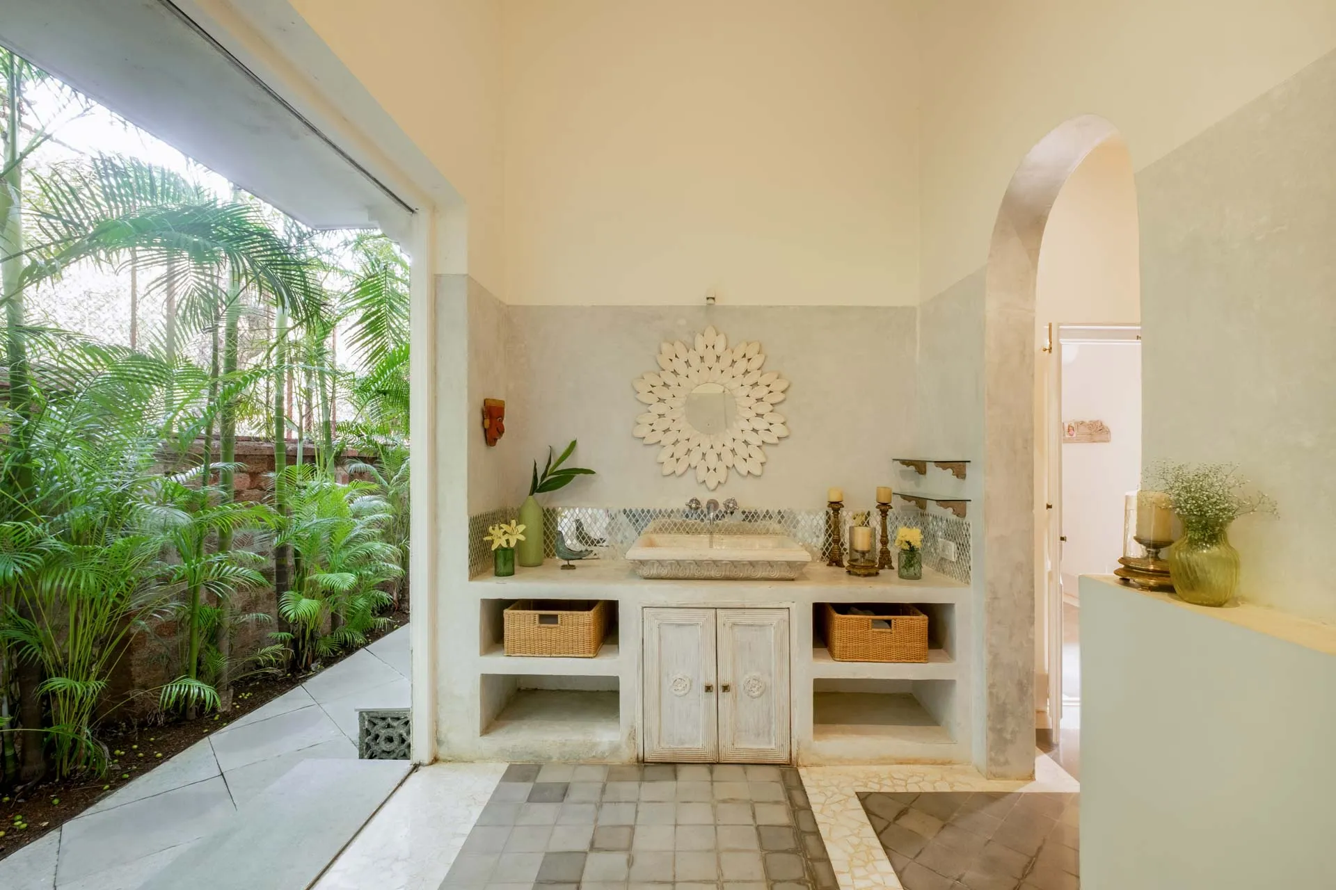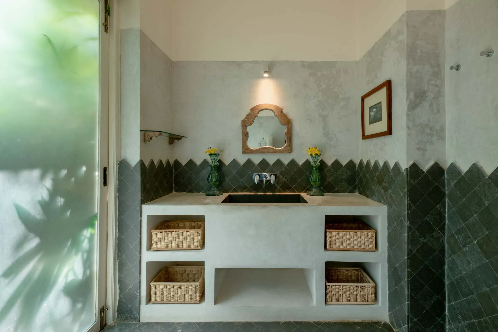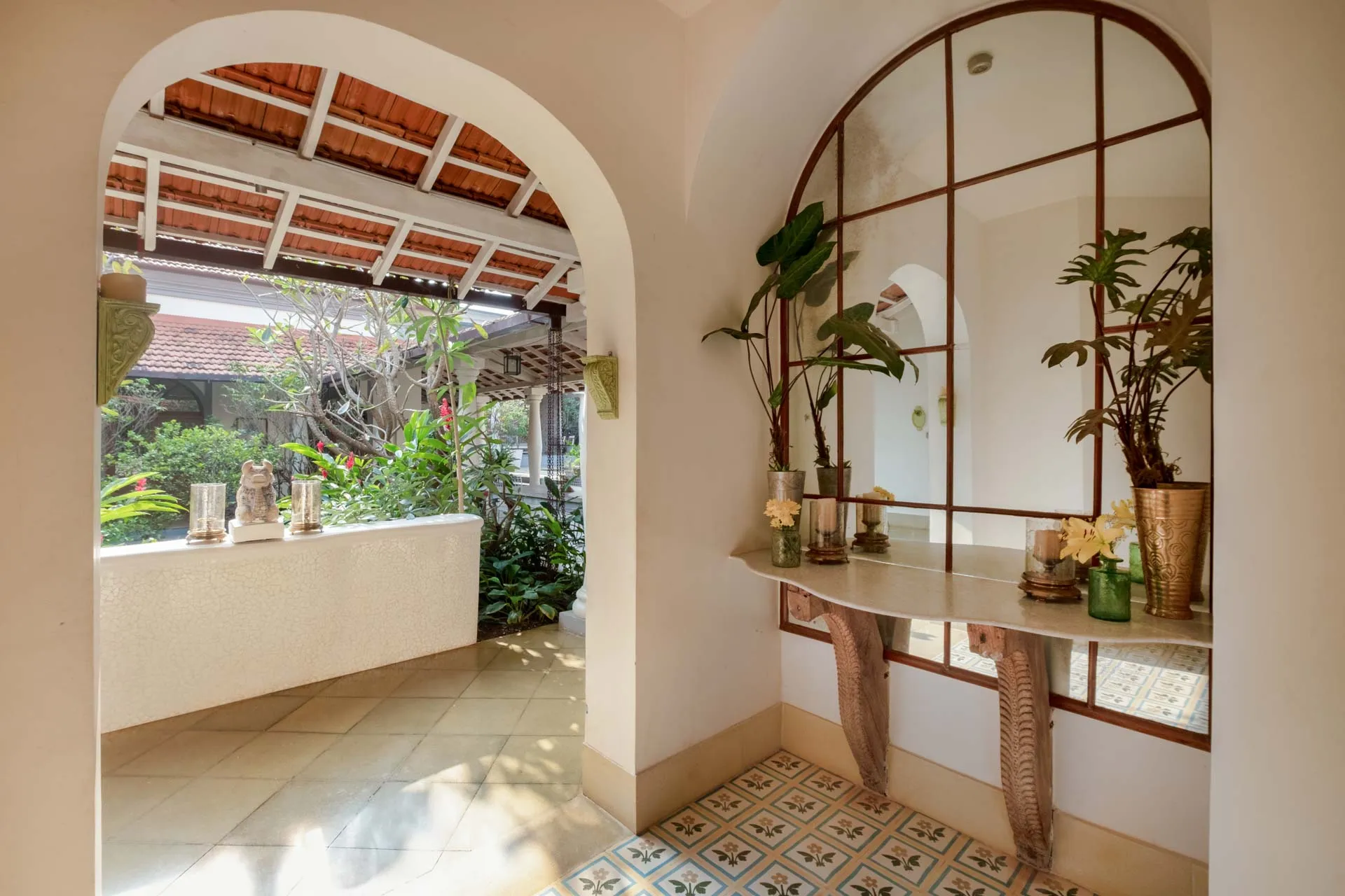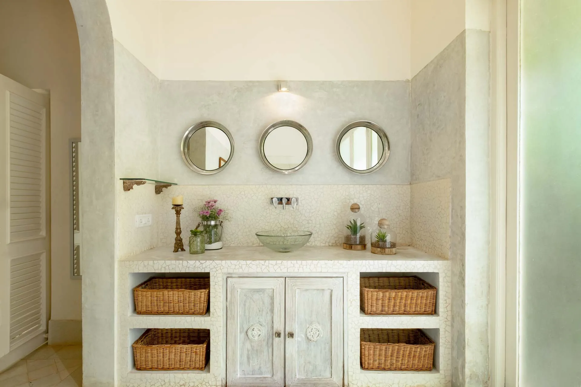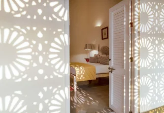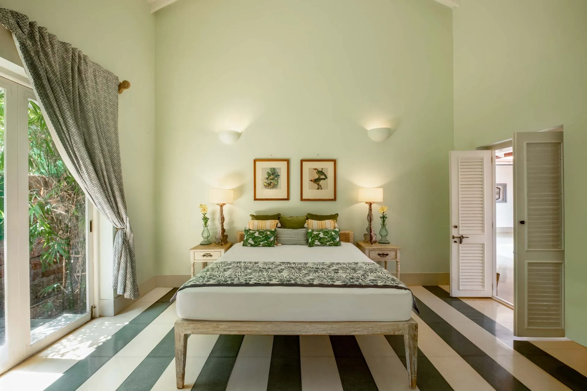 Villa Branco is a luxury villa for rent in Goa and located in between the villages of Anjuna and Assagaon. Its striking architectural and decor features are sure to fascinate design aficionados. The living room features refurbished wooden doors from India’s erstwhile royal darbars. Bedrooms have contemporary IPS walls and floors complemented by mirrored accents and antique bric-a-brac. The sea green pool has stone flooring with its characteristic texture and is surrounded by carved screens and louvered doors. This holiday home is especially apt for those wanting to celebrate a special occasion.