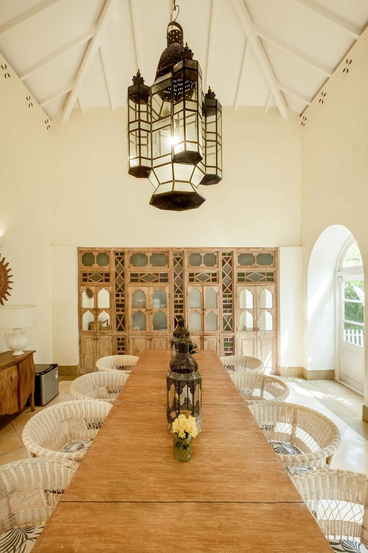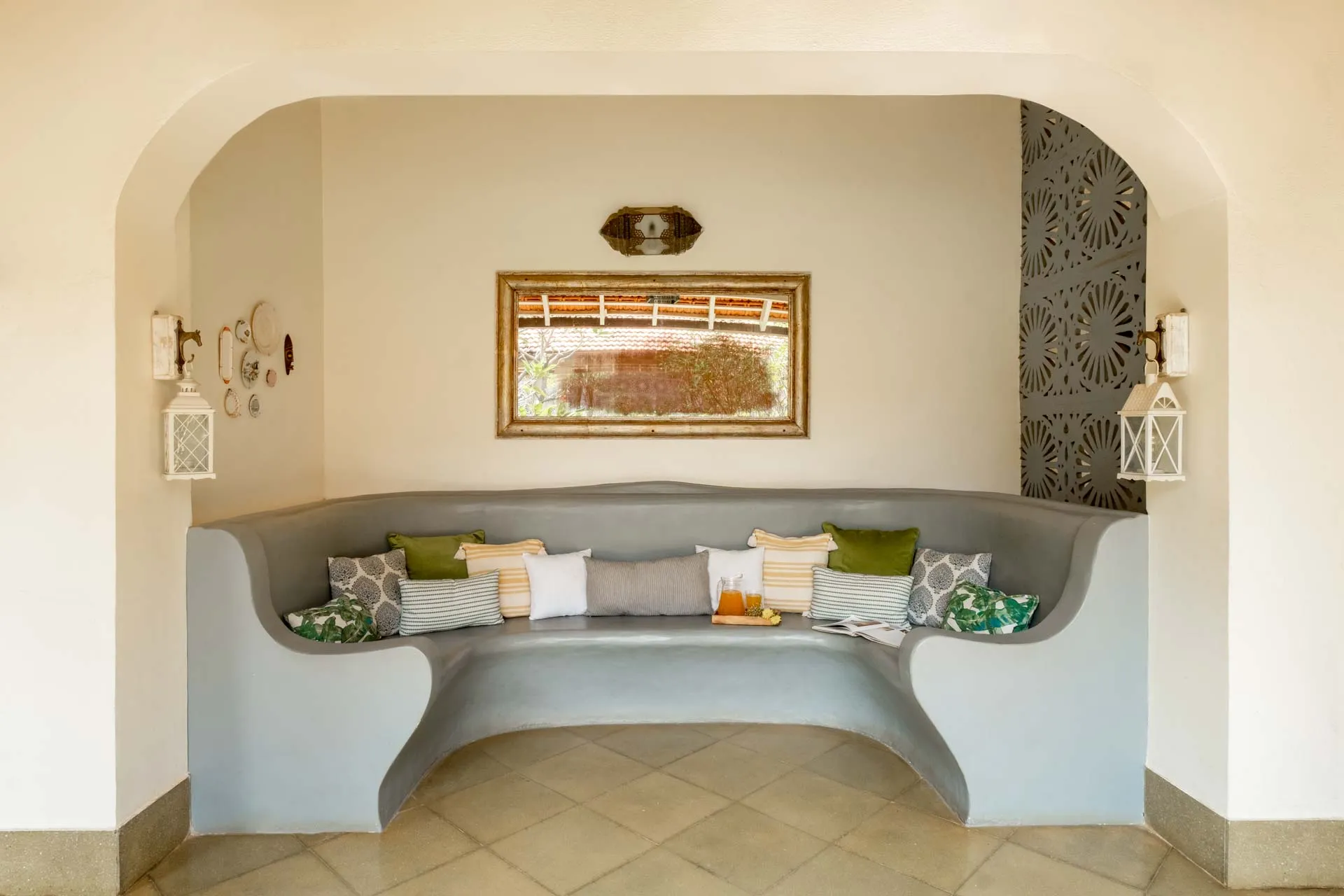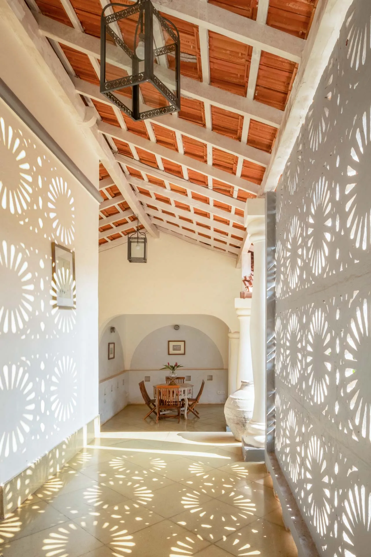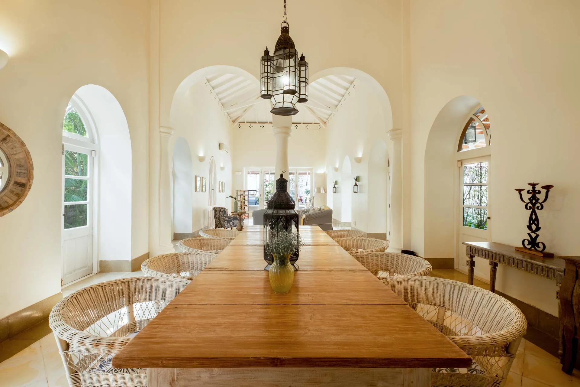 Villa Branco is a luxury villa for rent in Goa and located in between the villages of Anjuna and Assagaon. Its striking architectural and decor features are sure to fascinate design aficionados. The living room features refurbished wooden doors from India’s erstwhile royal darbars. Bedrooms have contemporary IPS walls and floors complemented by mirrored accents and antique bric-a-brac. The sea green pool has stone flooring with its characteristic texture and is surrounded by carved screens and louvered doors. This holiday home is especially apt for those wanting to celebrate a special occasion.