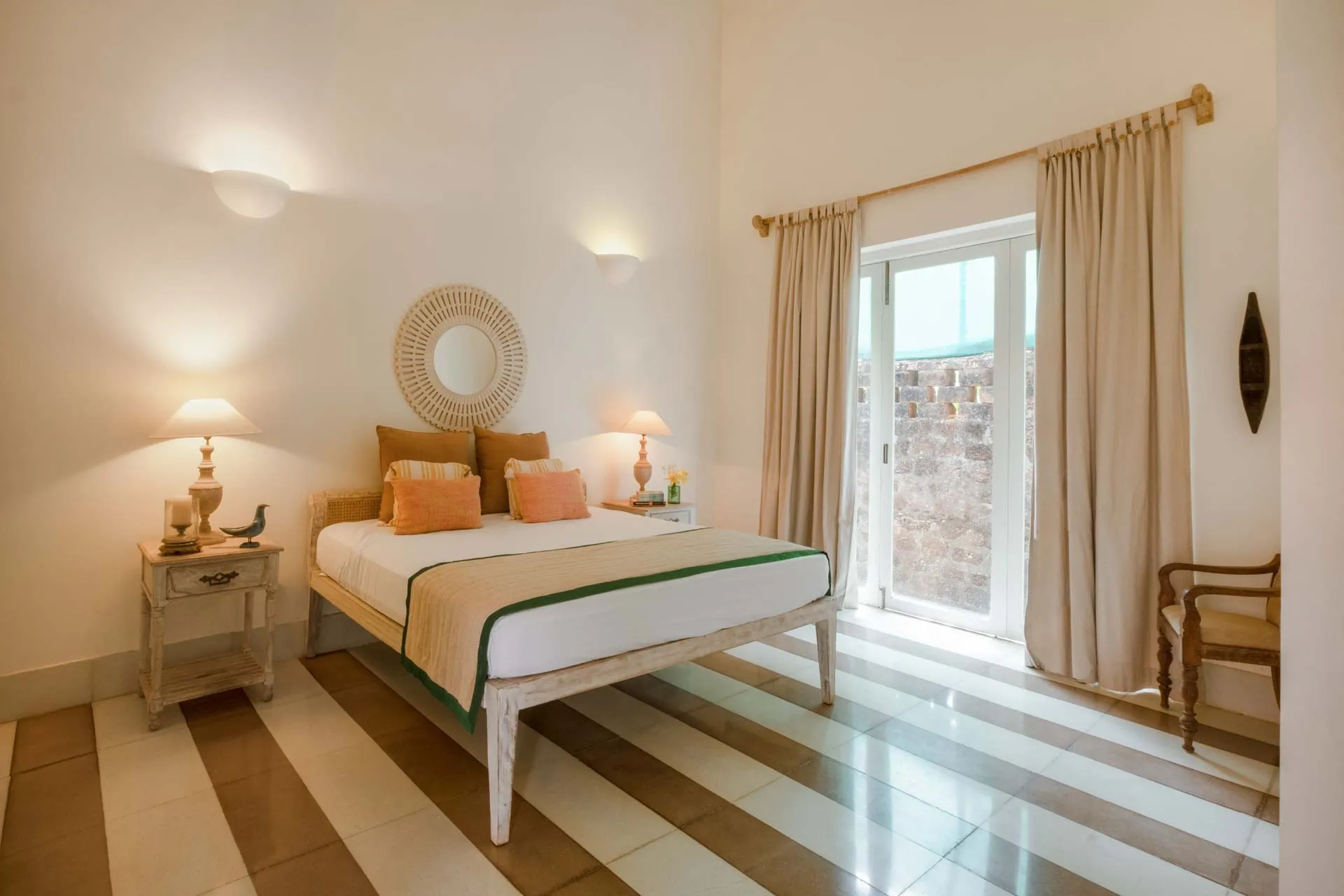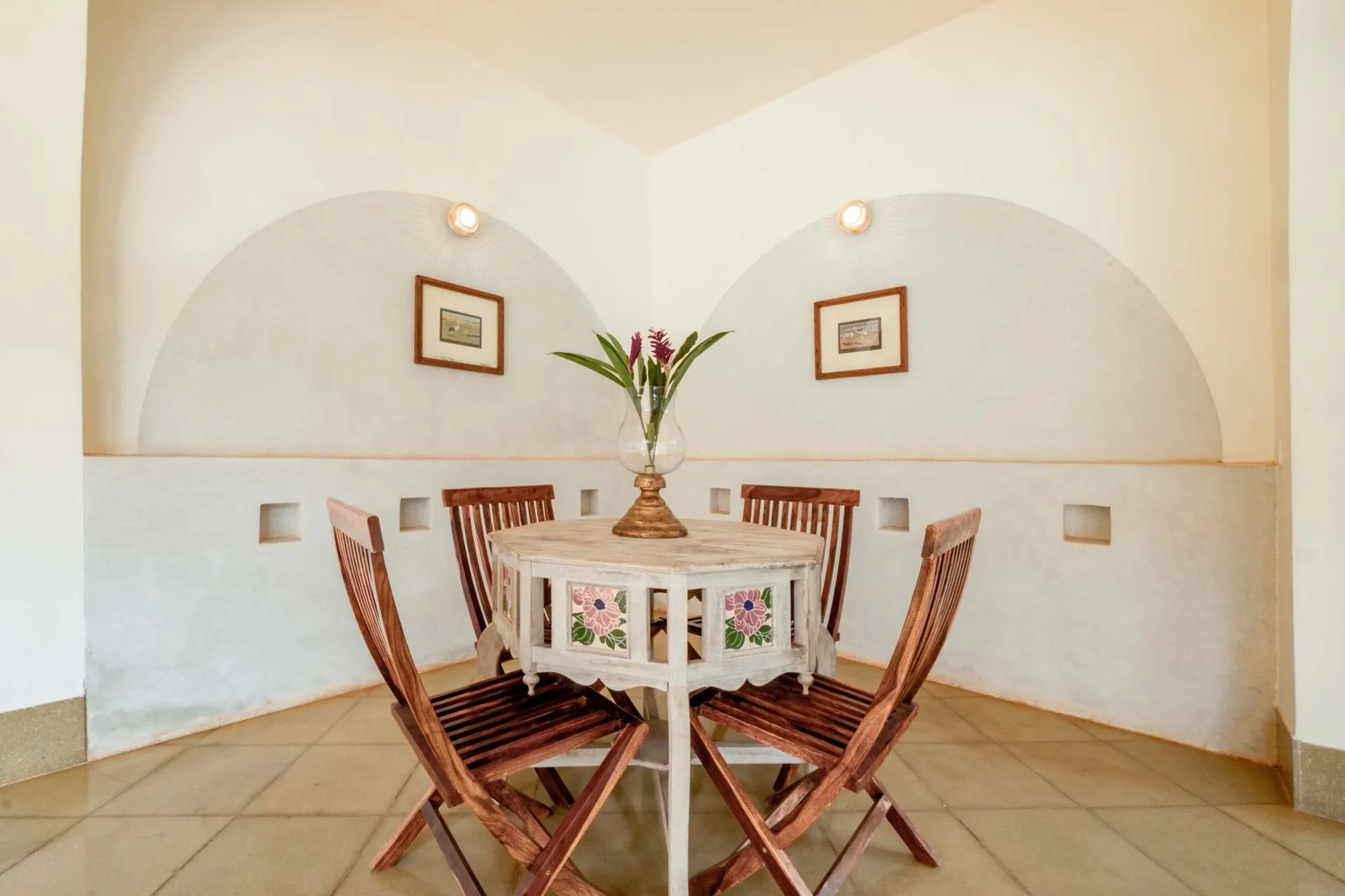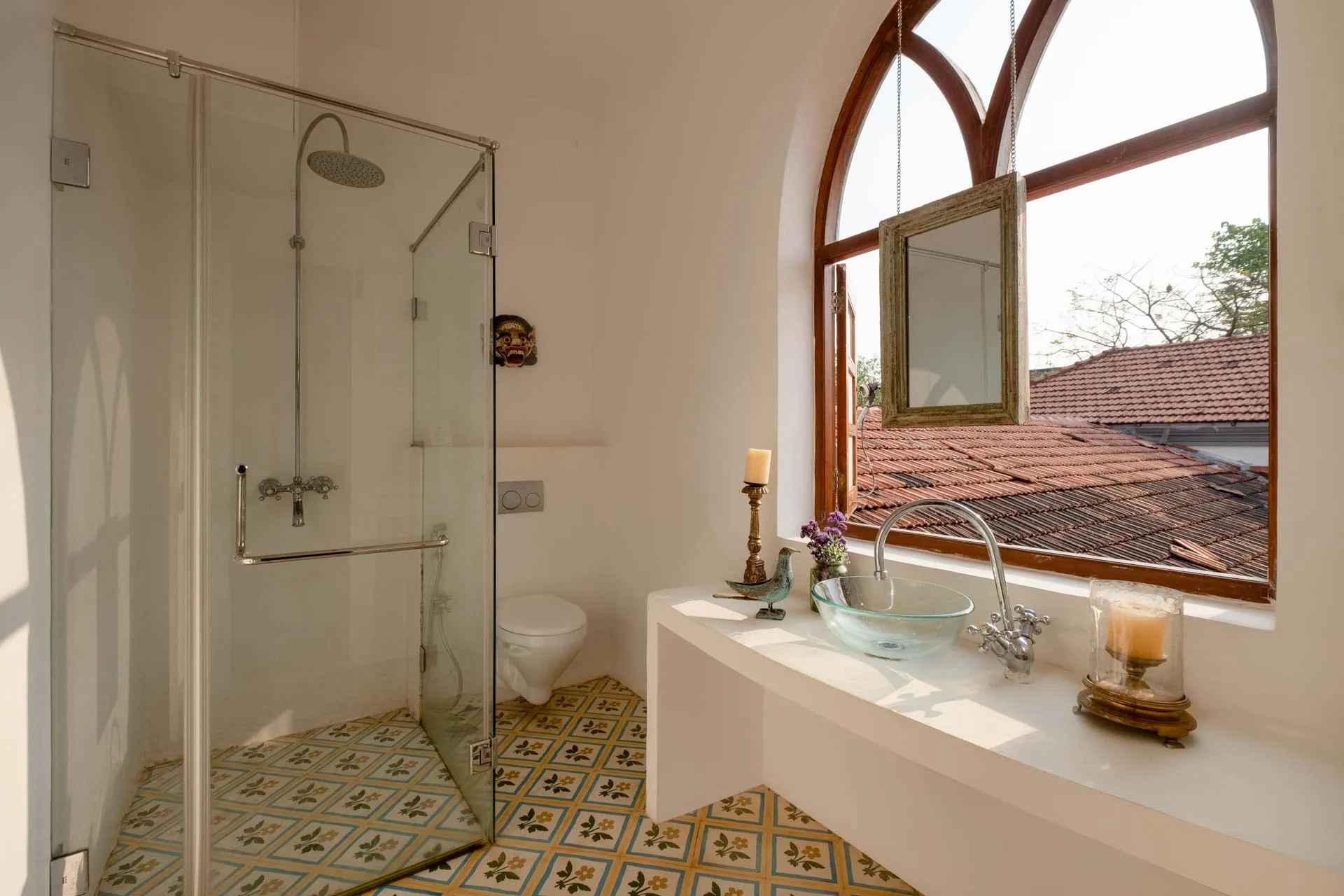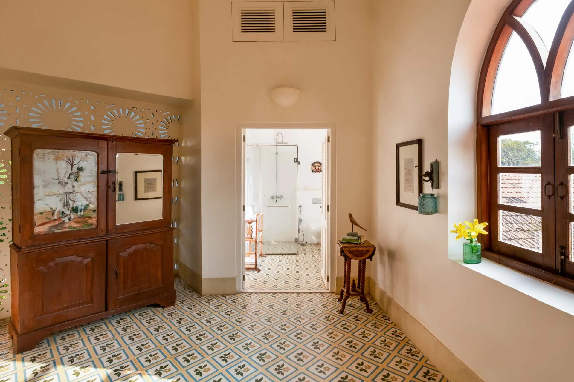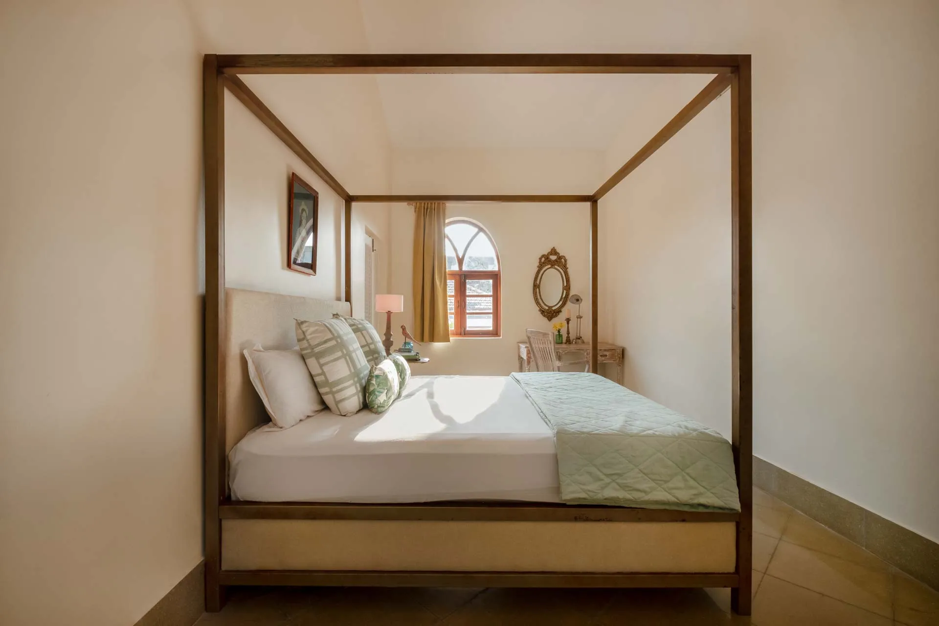 Villa Branco is a luxury villa for rent in Goa and located in between the villages of Anjuna and Assagaon. Its striking architectural and decor features are sure to fascinate design aficionados. The living room features refurbished wooden doors from India’s erstwhile royal darbars. Bedrooms have contemporary IPS walls and floors complemented by mirrored accents and antique bric-a-brac. The sea green pool has stone flooring with its characteristic texture and is surrounded by carved screens and louvered doors. This holiday home is especially apt for those wanting to celebrate a special occasion.