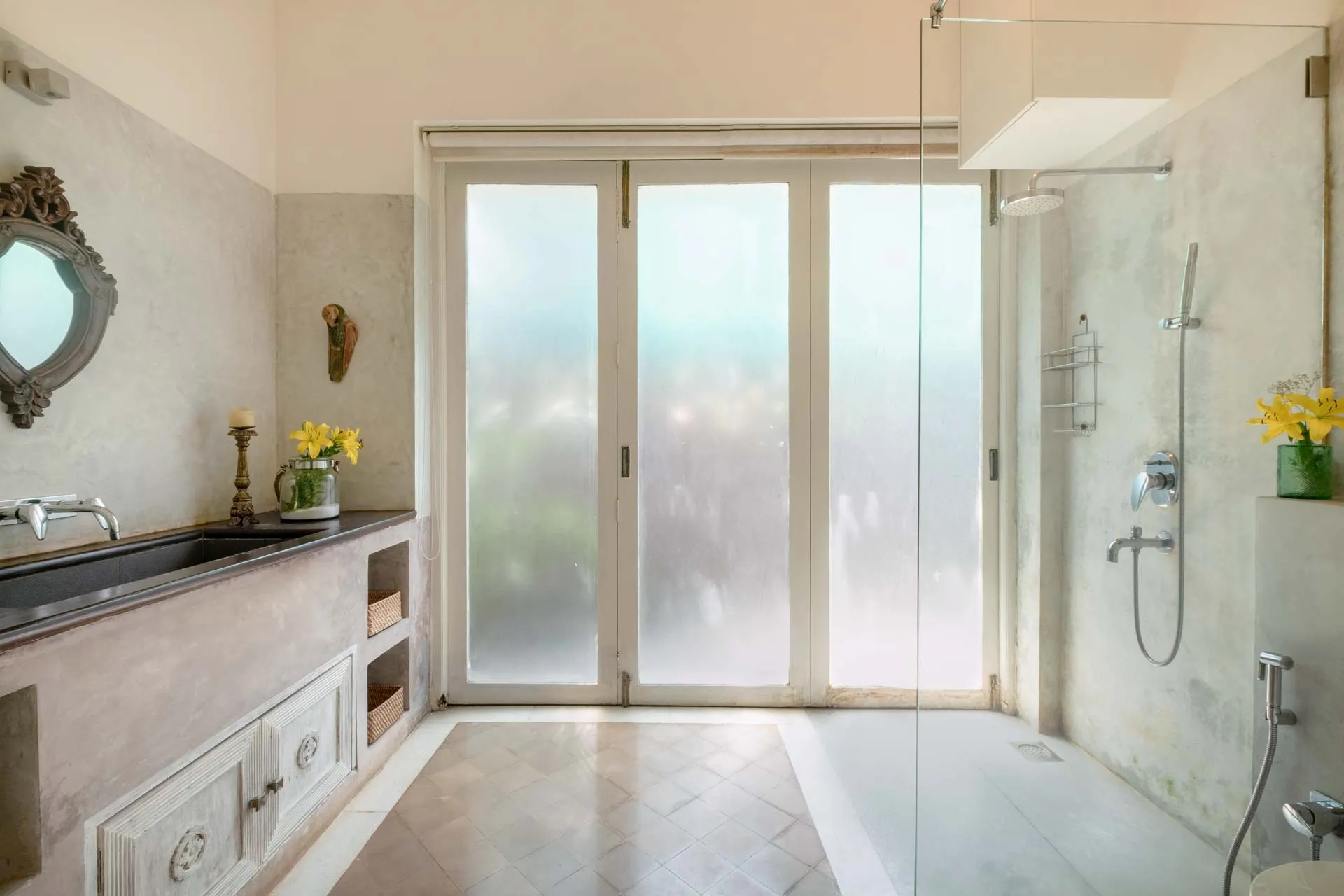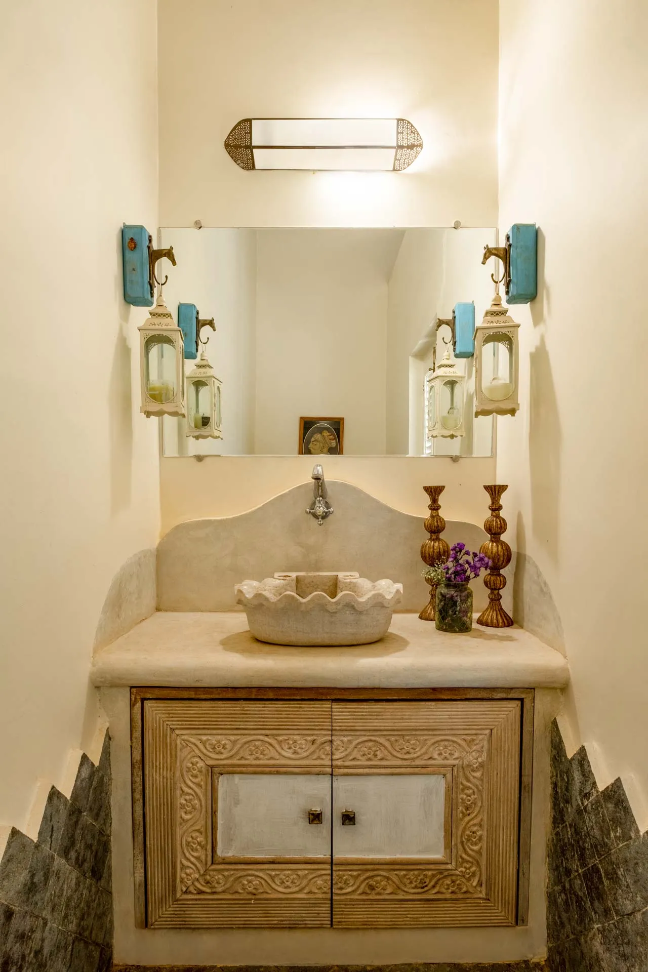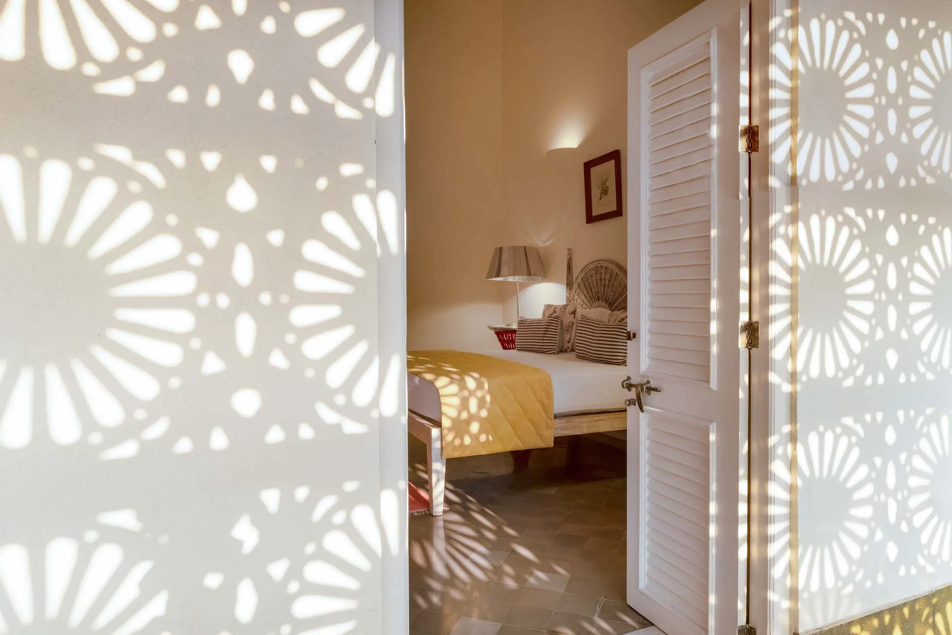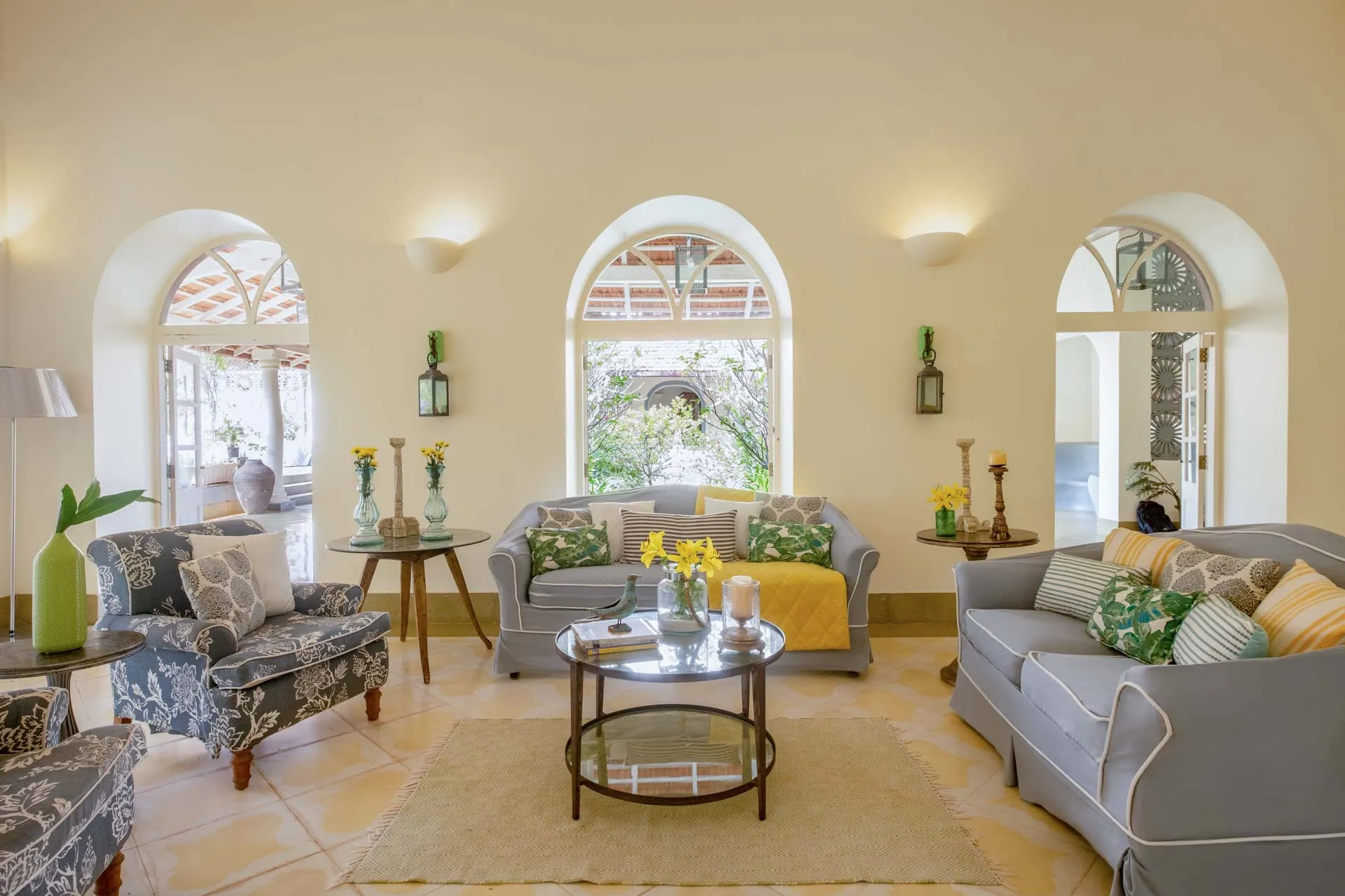 Villa Branco is a luxury villa for rent in Goa and located in between the villages of Anjuna and Assagaon. Its striking architectural and decor features are sure to fascinate design aficionados. The living room features refurbished wooden doors from India’s erstwhile royal darbars. Bedrooms have contemporary IPS walls and floors complemented by mirrored accents and antique bric-a-brac. The sea green pool has stone flooring with its characteristic texture and is surrounded by carved screens and louvered doors. This holiday home is especially apt for those wanting to celebrate a special occasion.