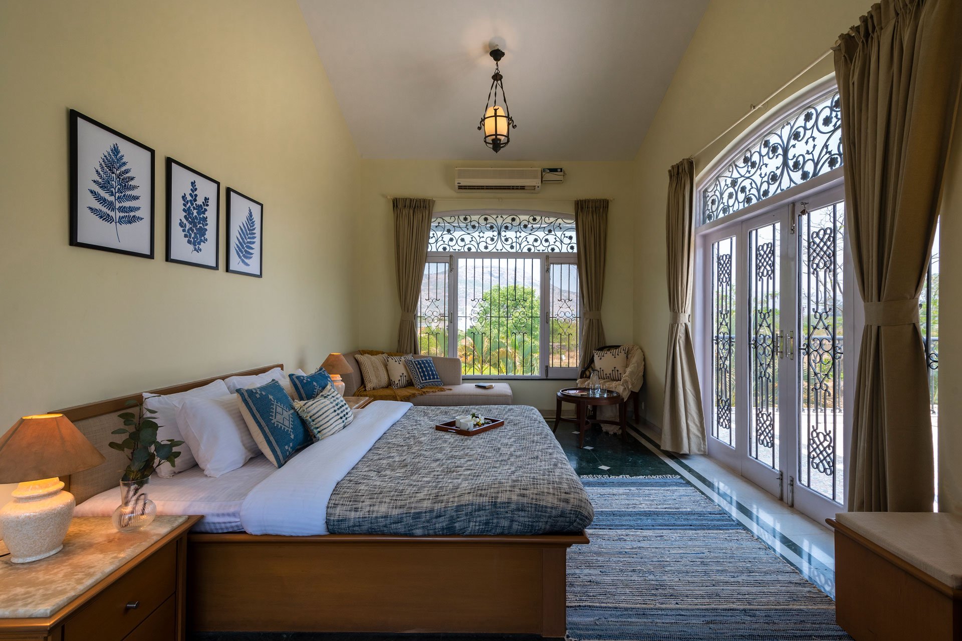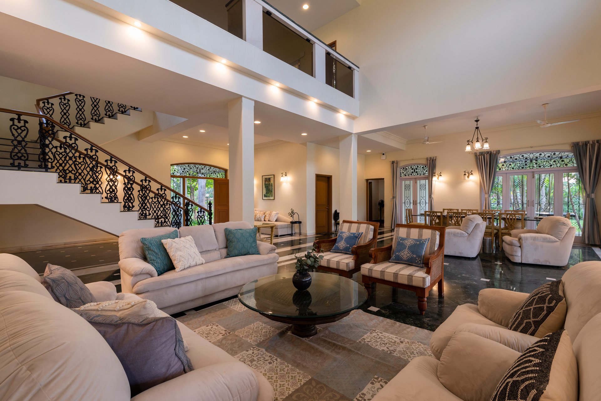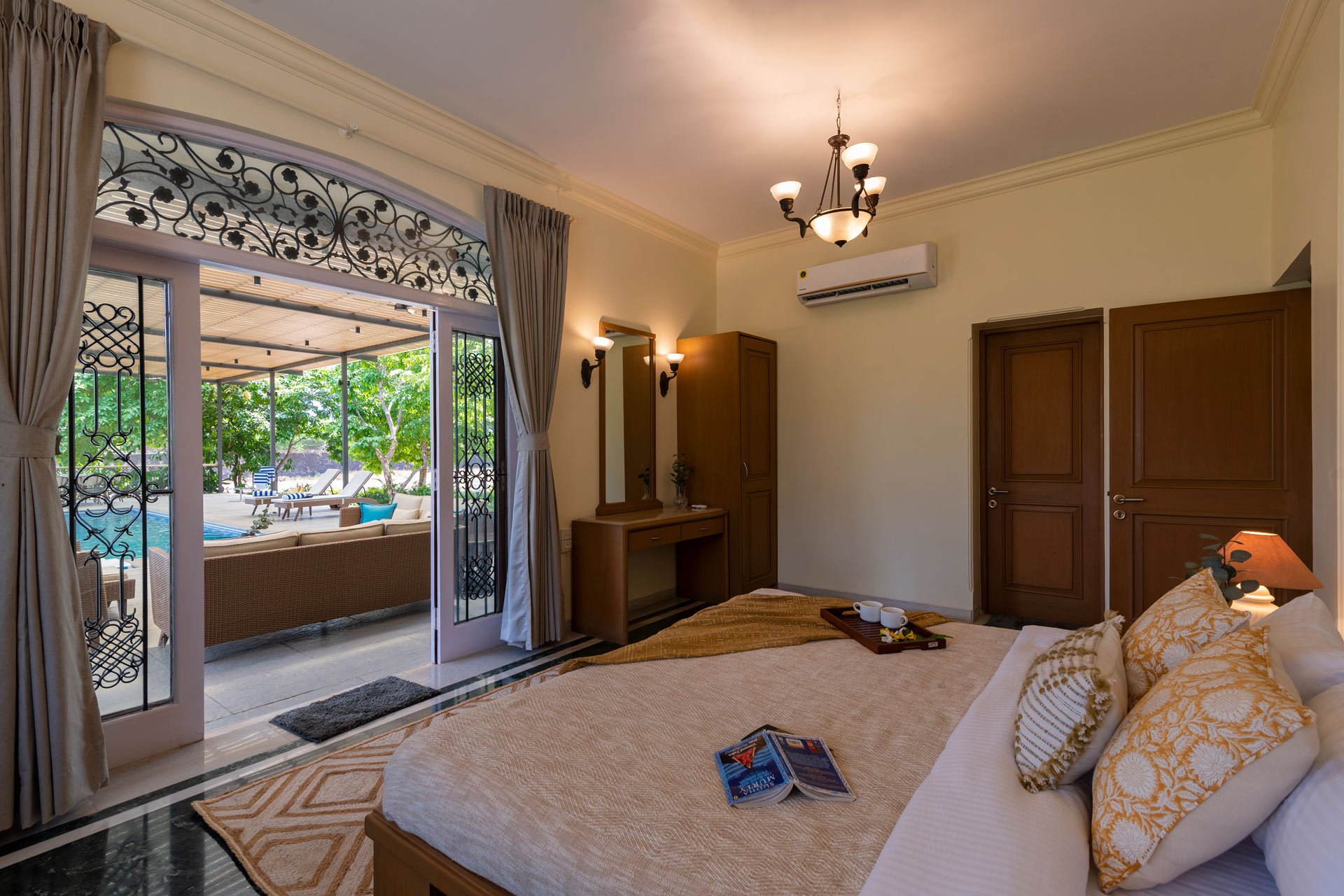 Spread across a whopping 10 acres, this sprawling holiday home is strategically tucked away from bustling city life, providing ideal respite from the chaos of every day. The villa features modern interiors, along with lavish amenities that are almost a prerequisite here. Rejuvenate, detox, and unwind at this serene home, that is enveloped in lush foliage and towering palms. Savour the misty breeze in the mornings, relax on the lounge-worthy sit-outs, and make the most of the rain shower, which are only some of the many features of this home. What’s more? There is a temperature-controlled heated swimming pool, perfect for a swim during the winters!