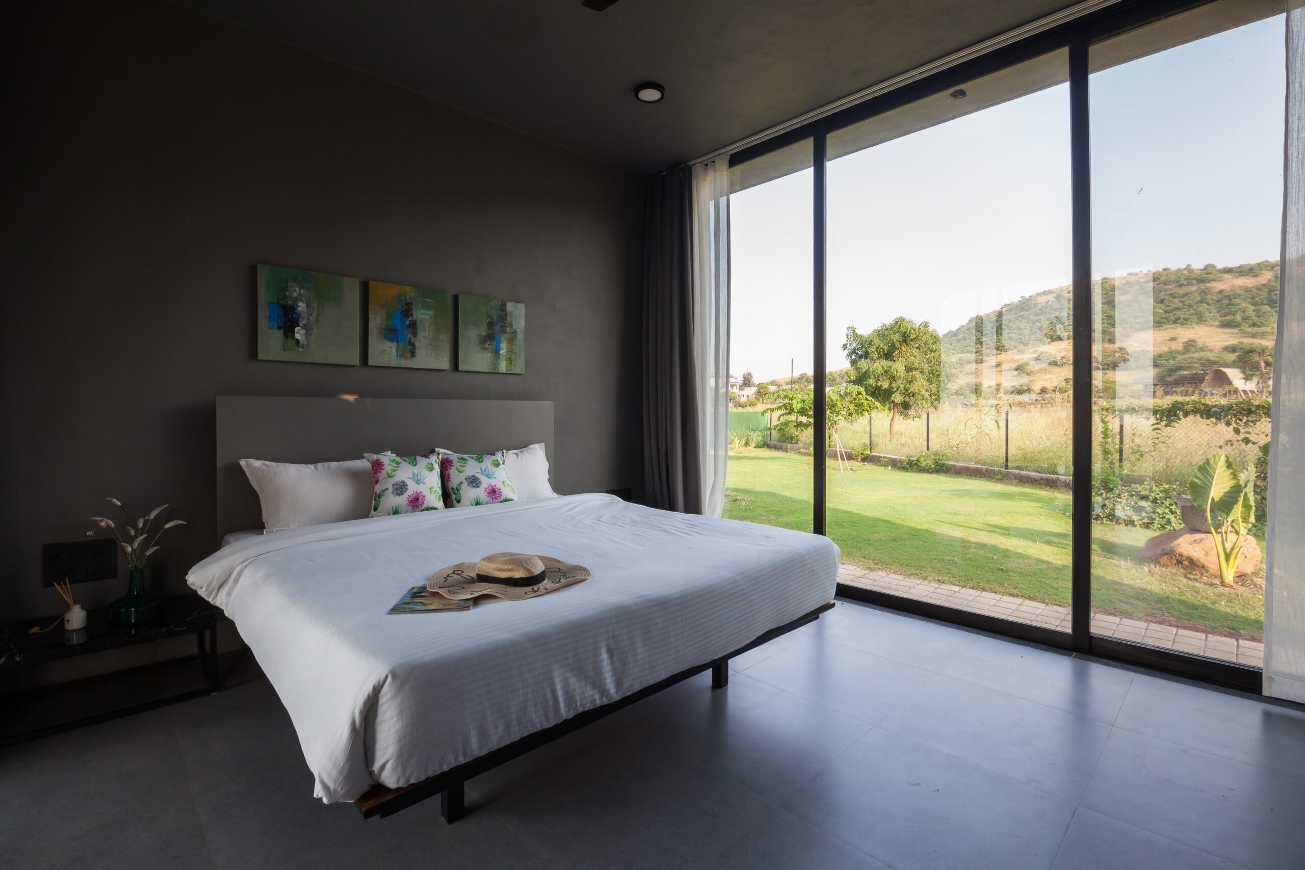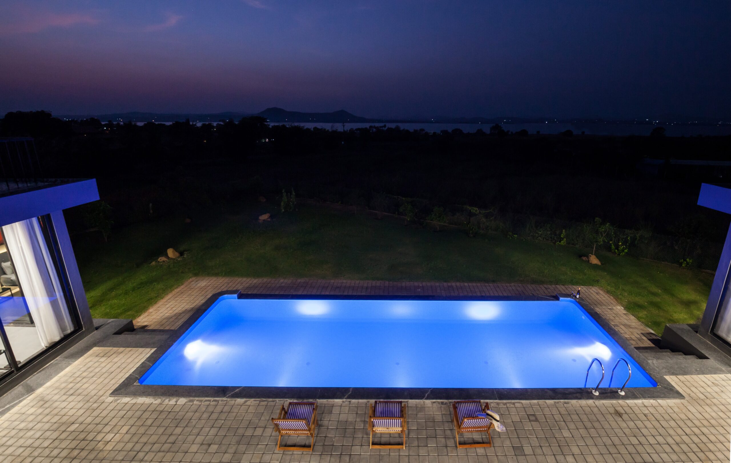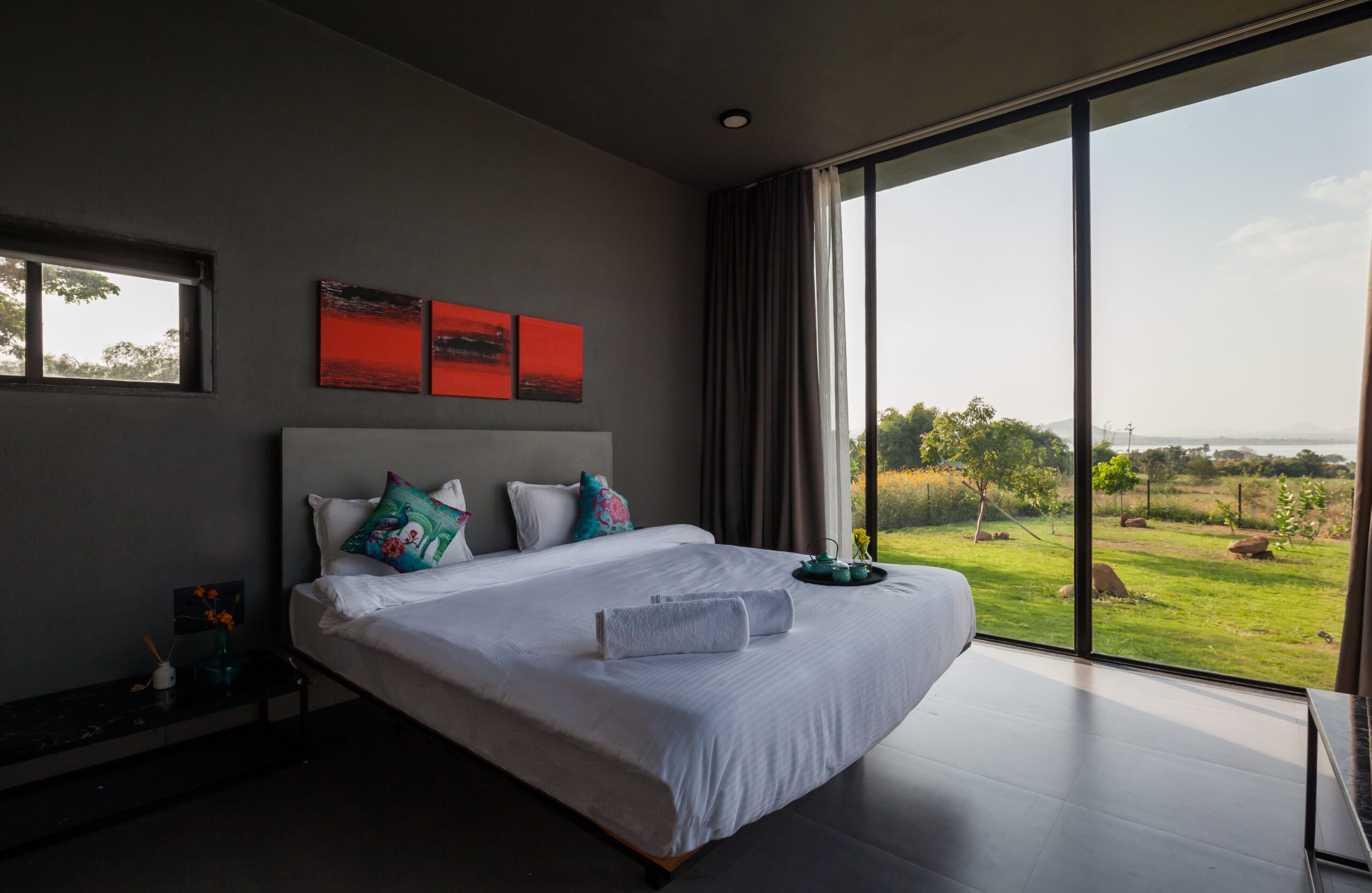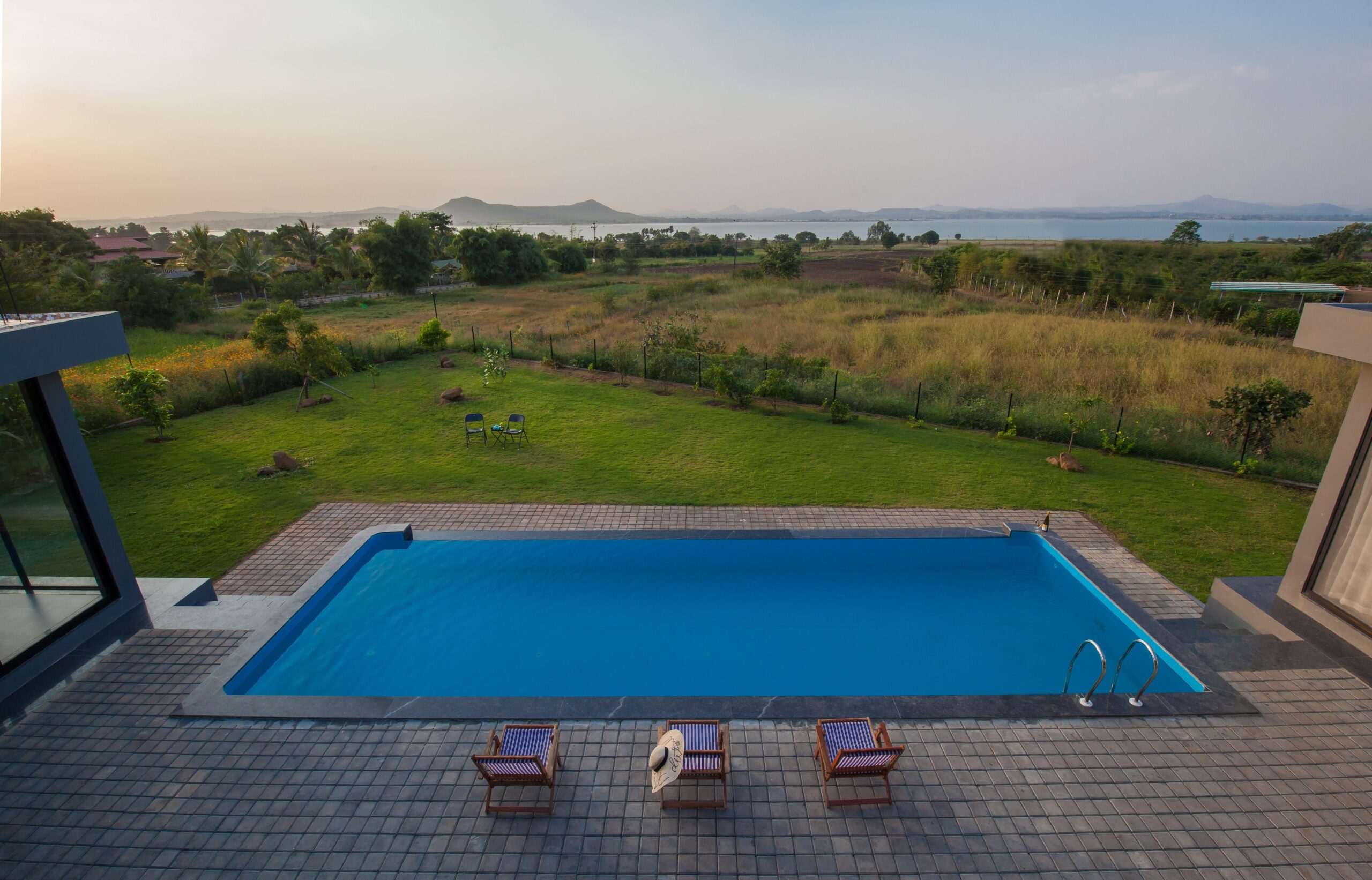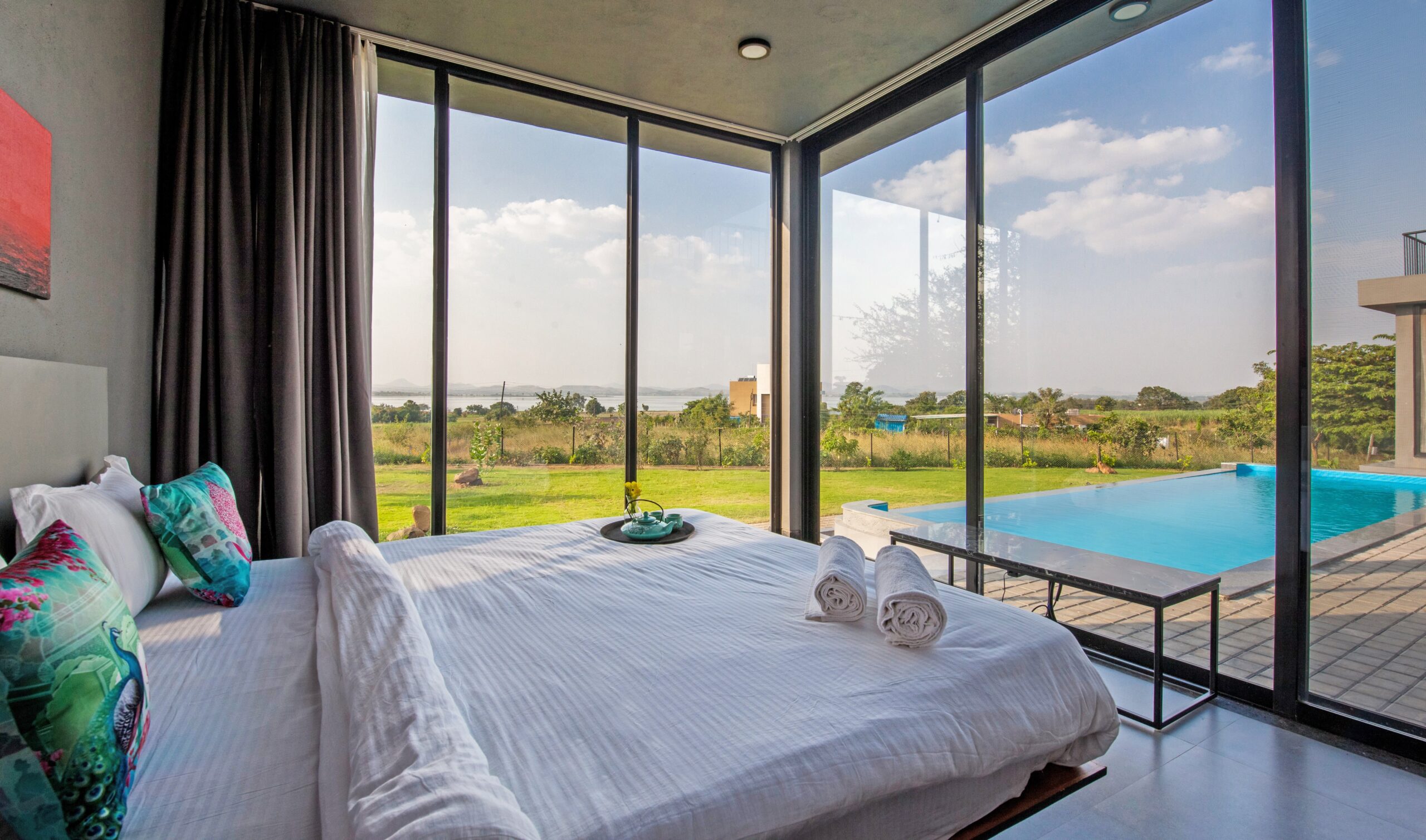 This Villa is a minimalistic, luxurious villa, with a gorgeous outdoor pool that overlooks lush greenery and a serene lake. The French windows allow a lot of natural light in, keeping the energy of the space upbeat and positive. The living area has a view of the pool in its beautiful, natural setting. The bedrooms all have hotel-style king-sized beds, and bathrooms are tidy, with a 24/7 hot water supply available. With a huge lawn that can accommodate about 100 people and private parking space for 10 cars, this space is perfect for events as well. Whether it is a big event or just a small group of your favourites getting away, this villa is sure to offer you a time to cherish forever.