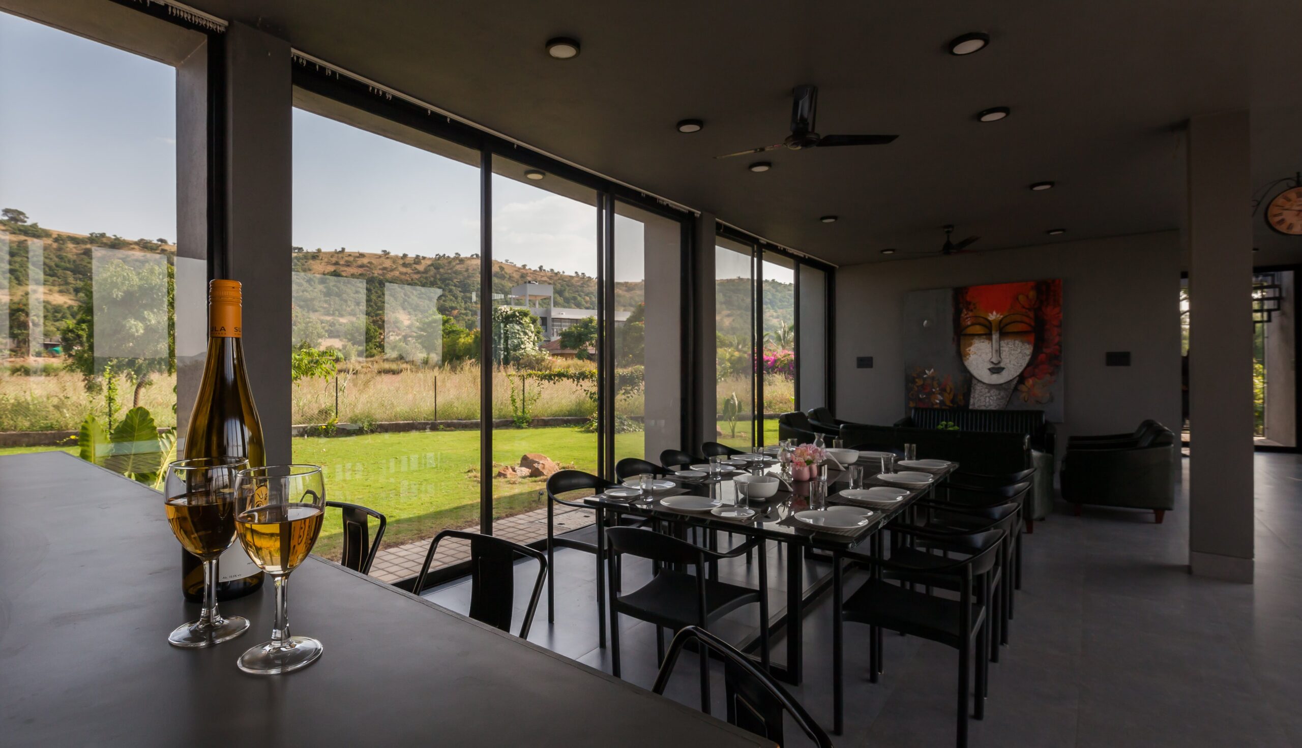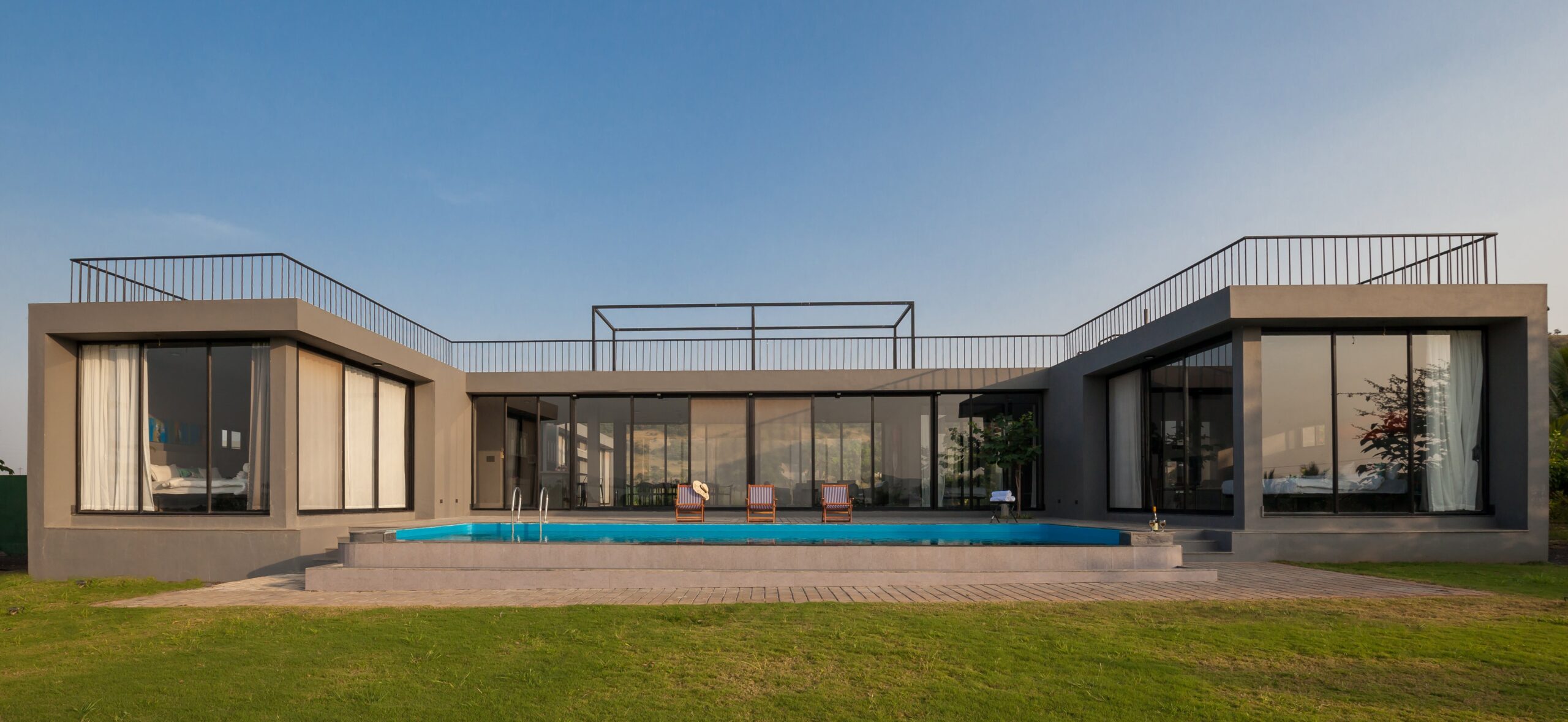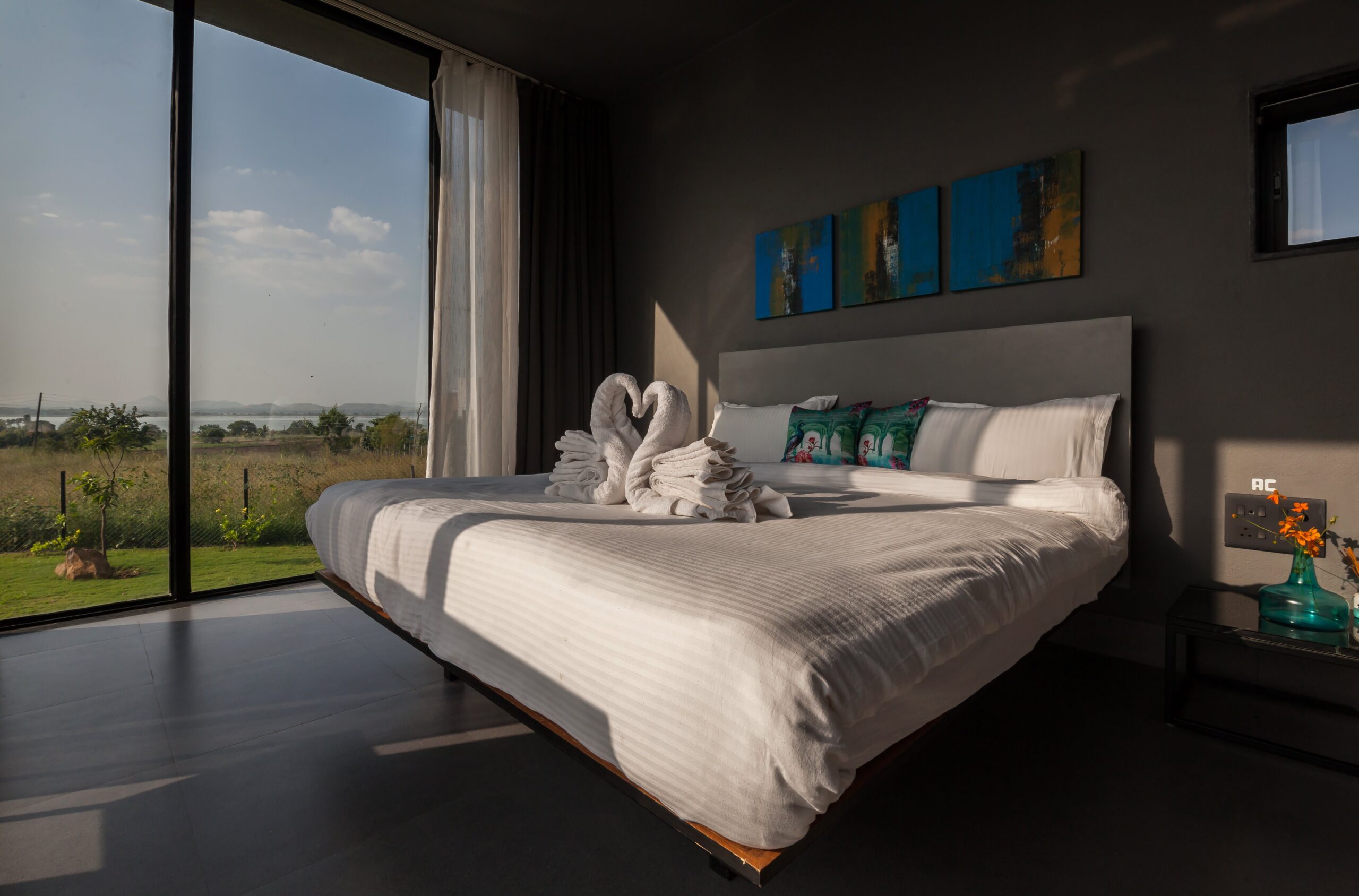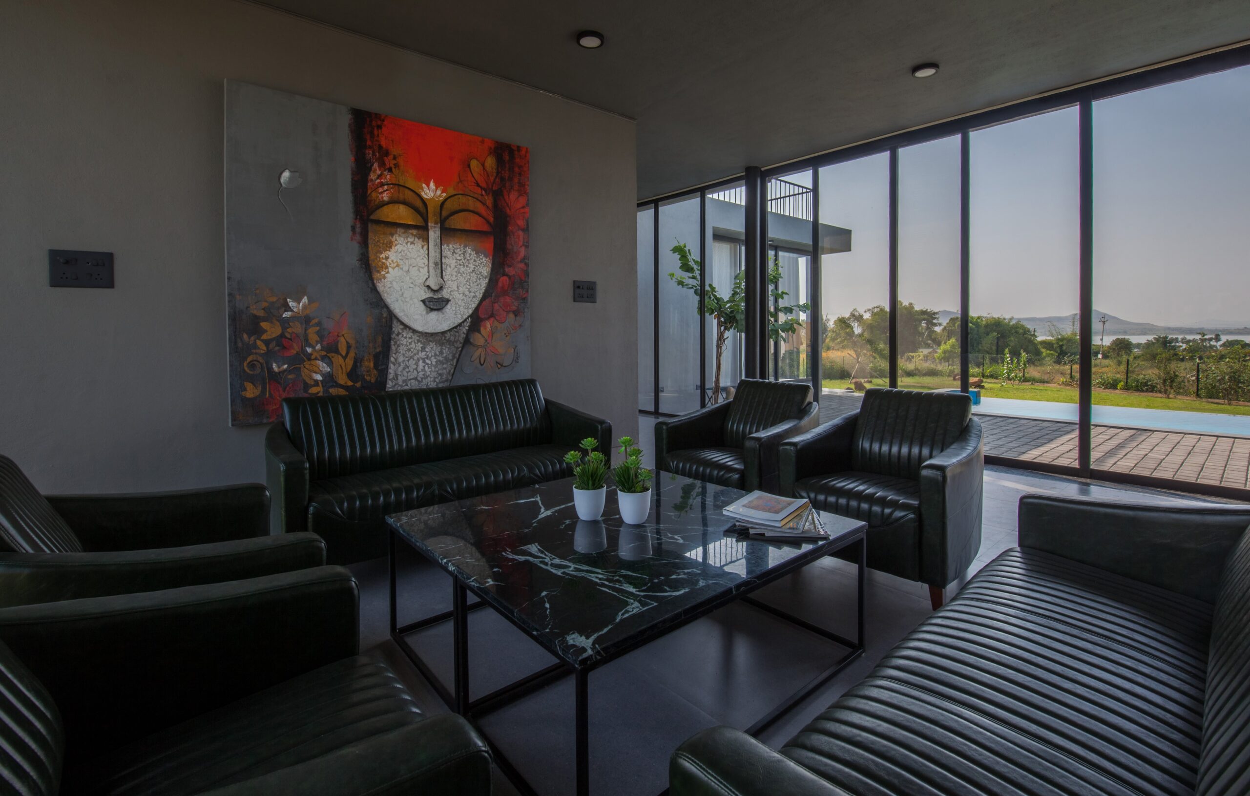 This Villa is a minimalistic, luxurious villa, with a gorgeous outdoor pool that overlooks lush greenery and a serene lake. The French windows allow a lot of natural light in, keeping the energy of the space upbeat and positive. The living area has a view of the pool in its beautiful, natural setting. The bedrooms all have hotel-style king-sized beds, and bathrooms are tidy, with a 24/7 hot water supply available. With a huge lawn that can accommodate about 100 people and private parking space for 10 cars, this space is perfect for events as well. Whether it is a big event or just a small group of your favourites getting away, this villa is sure to offer you a time to cherish forever.