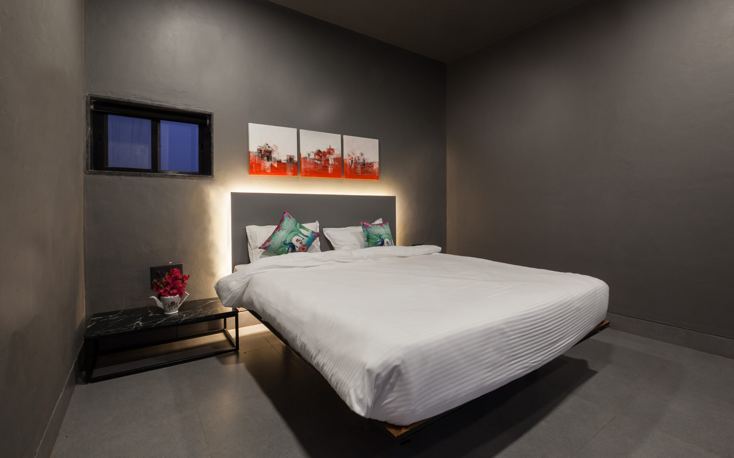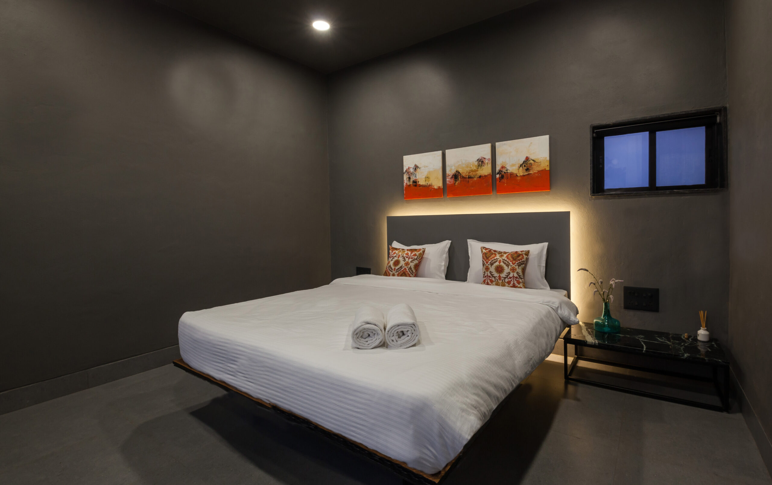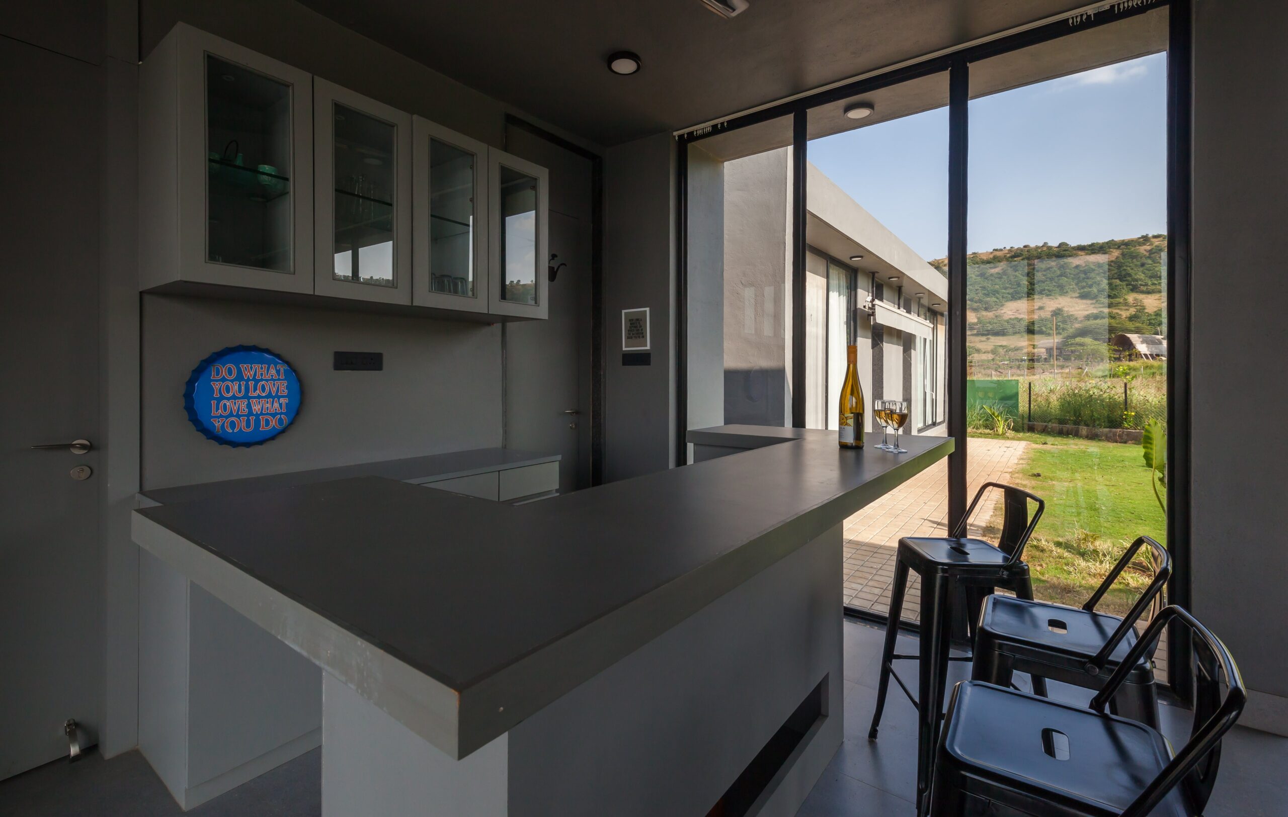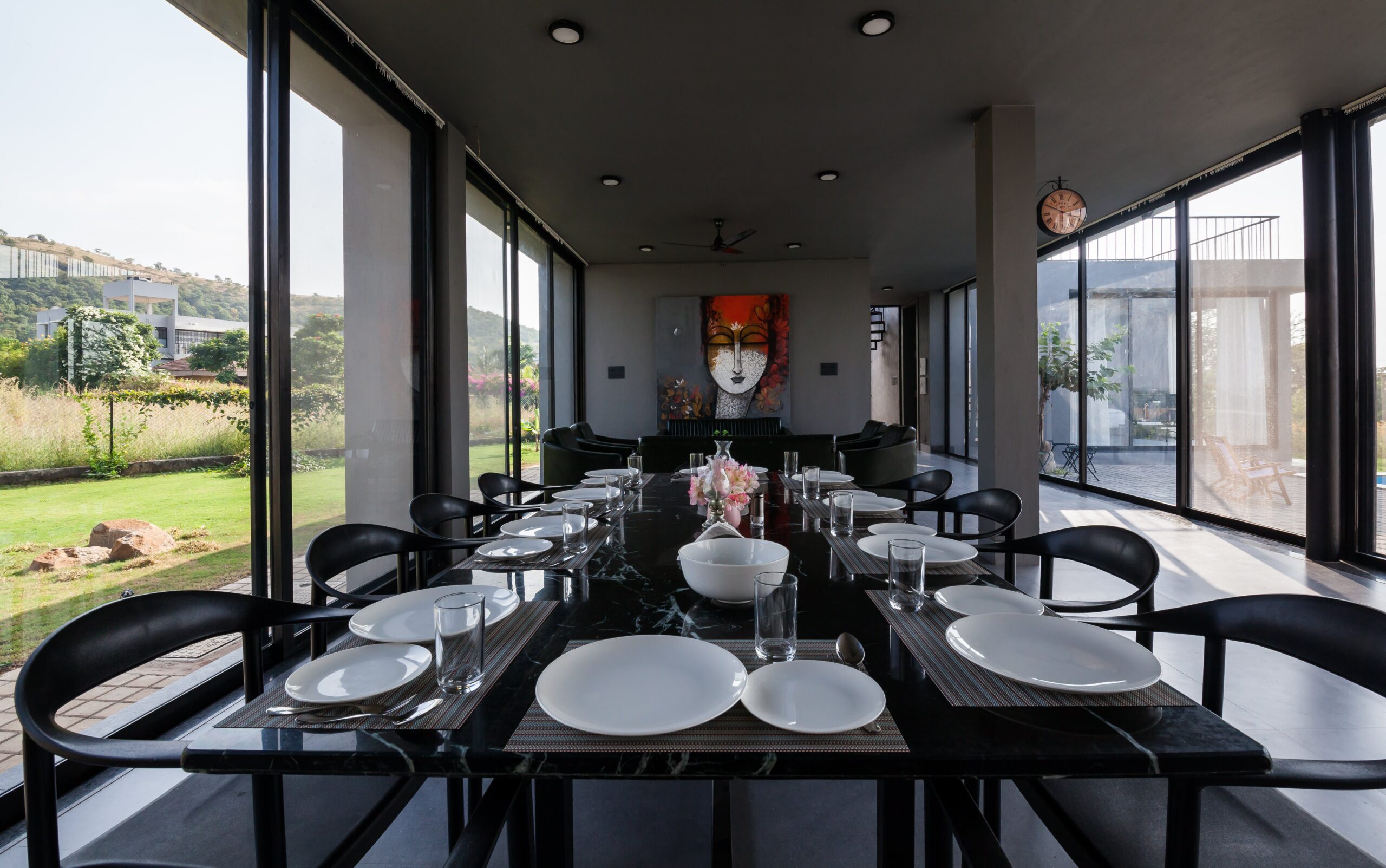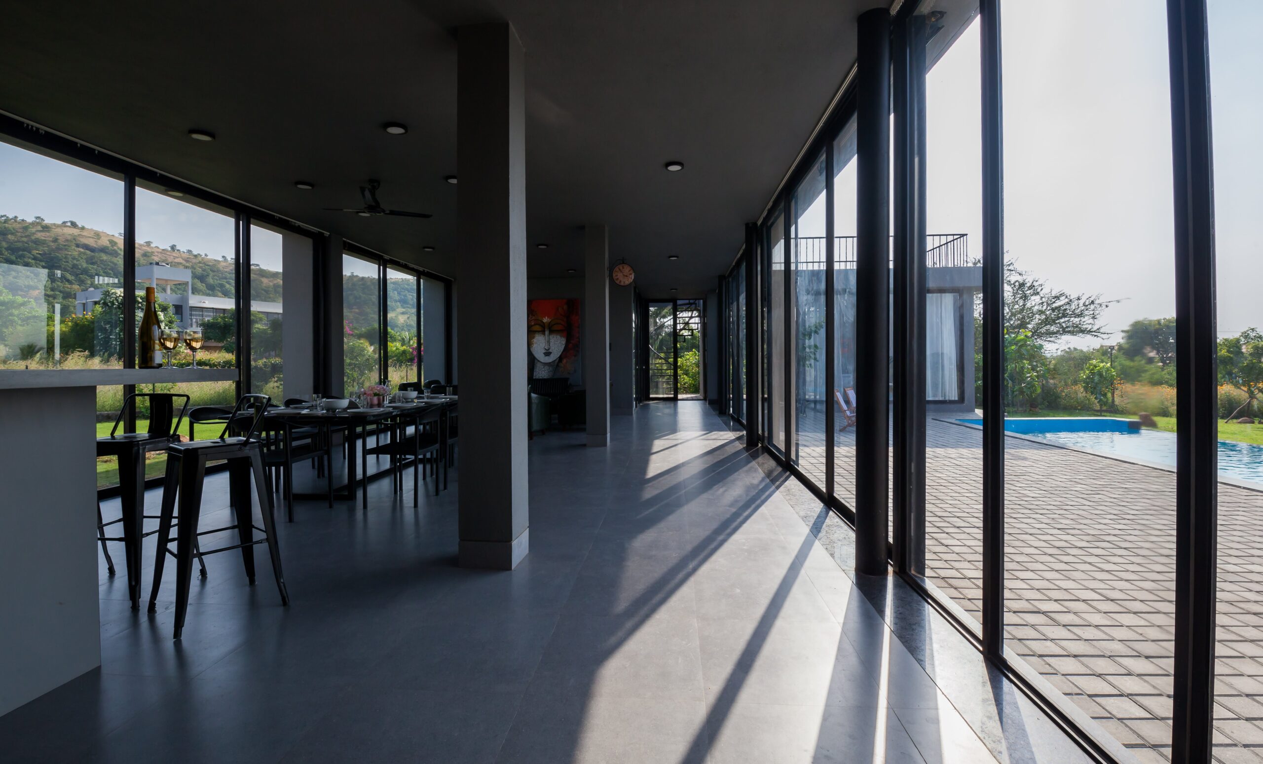 This Villa is a minimalistic, luxurious villa, with a gorgeous outdoor pool that overlooks lush greenery and a serene lake. The French windows allow a lot of natural light in, keeping the energy of the space upbeat and positive. The living area has a view of the pool in its beautiful, natural setting. The bedrooms all have hotel-style king-sized beds, and bathrooms are tidy, with a 24/7 hot water supply available. With a huge lawn that can accommodate about 100 people and private parking space for 10 cars, this space is perfect for events as well. Whether it is a big event or just a small group of your favourites getting away, this villa is sure to offer you a time to cherish forever.