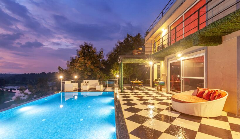 Ornamented with verdant vines, the stylish and sleek interiors also add a splash of vibrant emanation throughout the expanse of this charming abode. Located just a stone’s throw away from one of the busiest metropolises of Mumbai, Vine & Splash is all things fun as well as mellow; for those seeking an escape from their mundane lives. Enjoy a splash in the infinity pool while getting a glimpse of the sunsets and star-studded skies that provide a great backdrop for this home. What’s more? Get to enjoy the sunny bliss and unending views of the surroundings while relaxing on the mosaiced deck area.