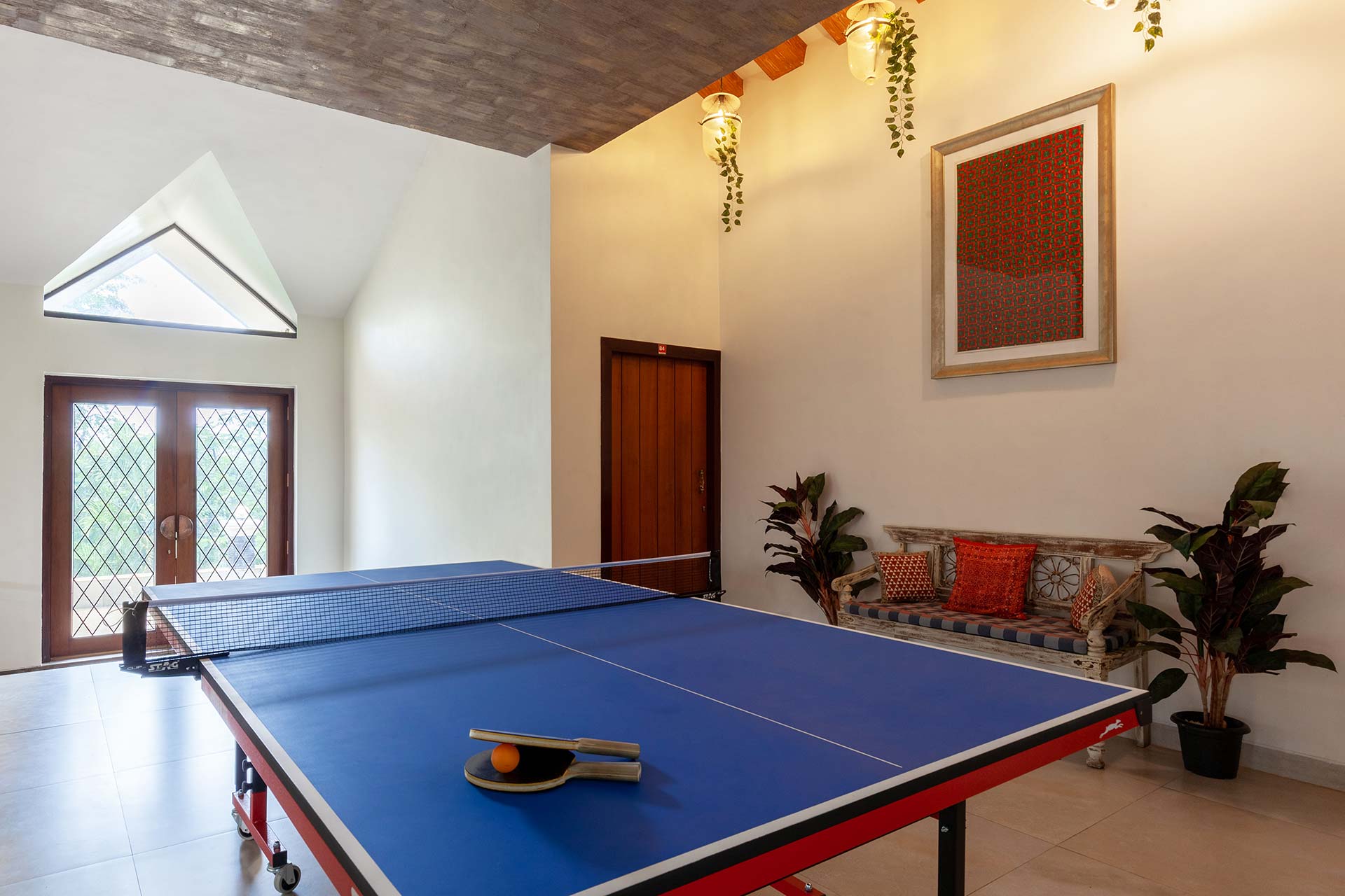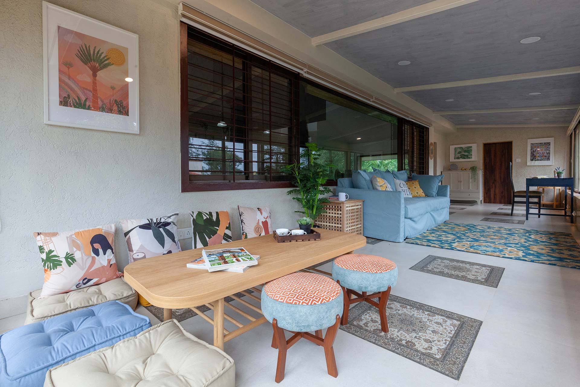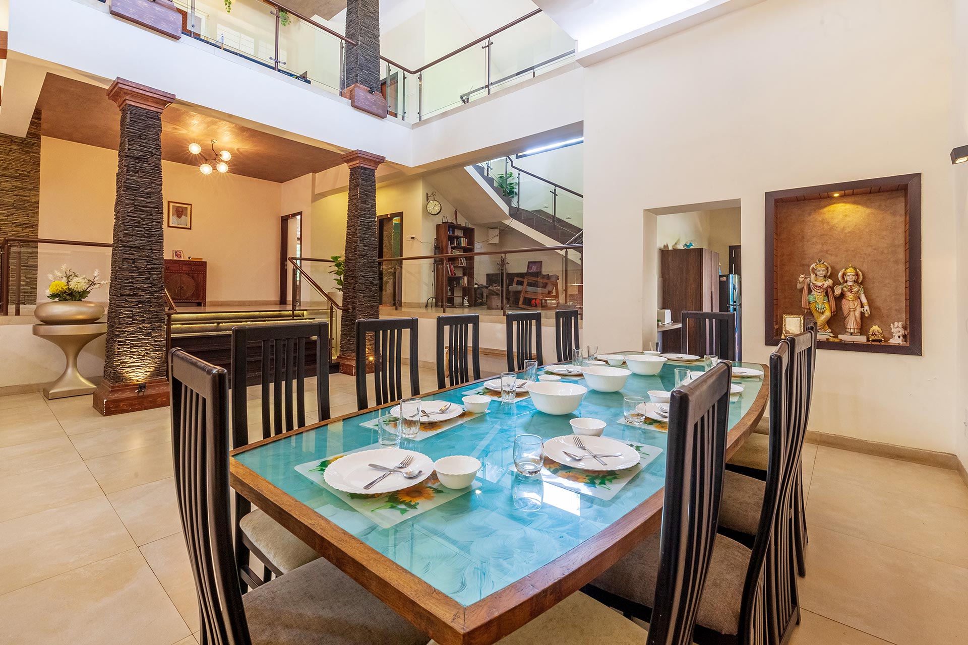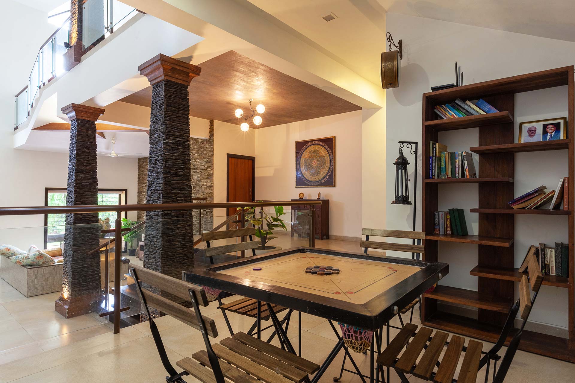– The home opens up to a spacious living room on the ground floor, replete with plush seating arrangements and stocked bookshelves along with a carrom board.