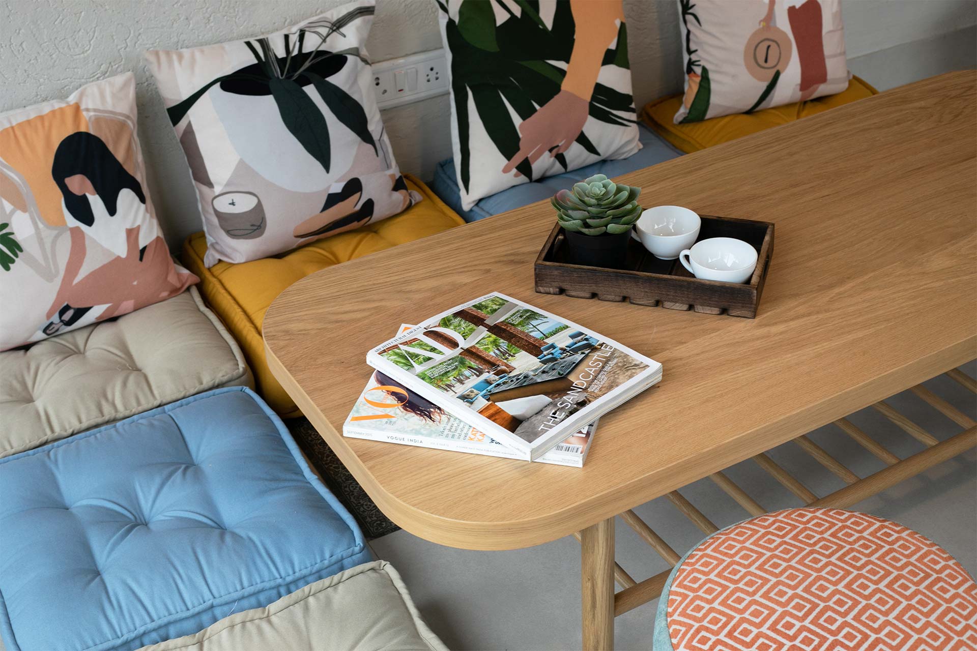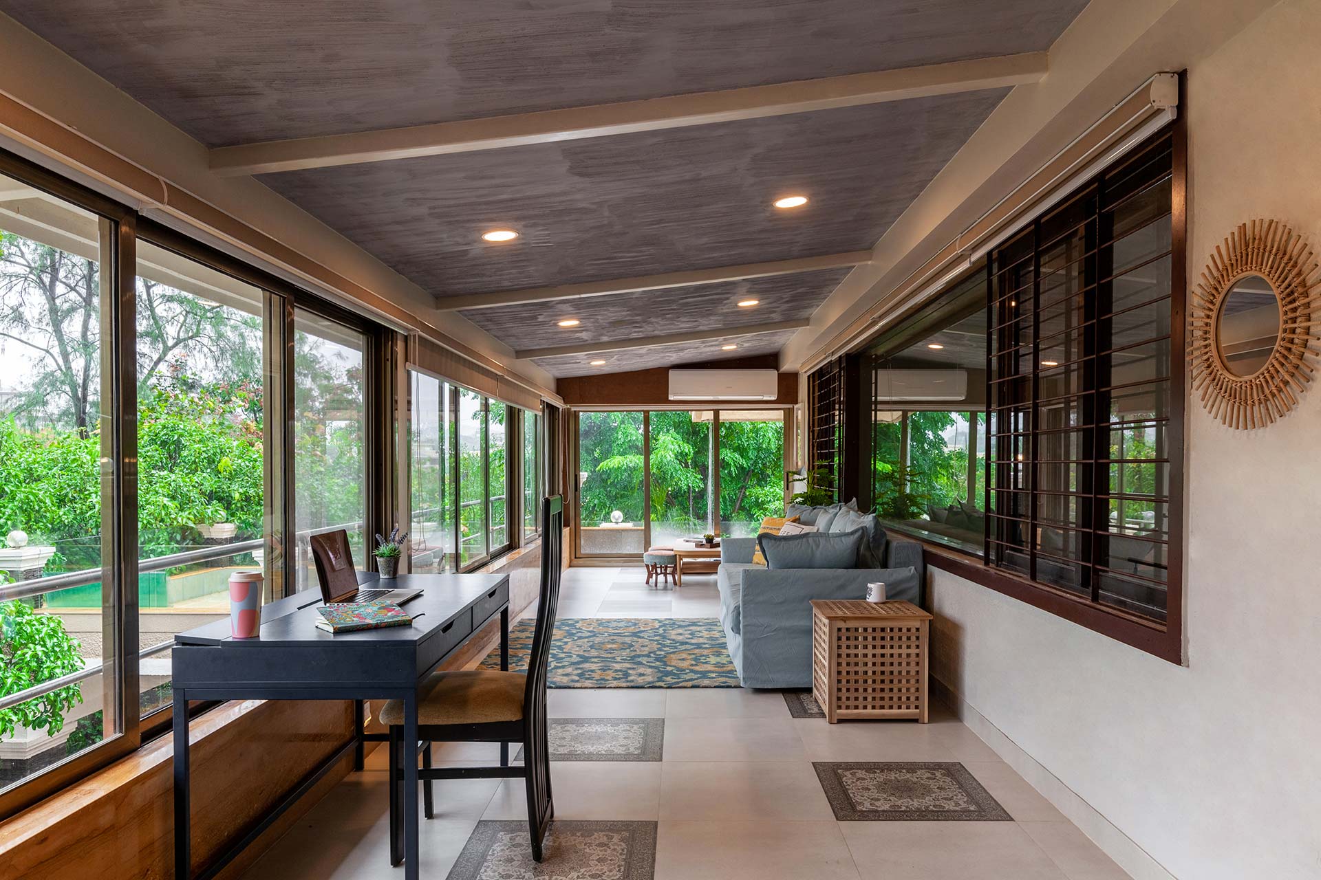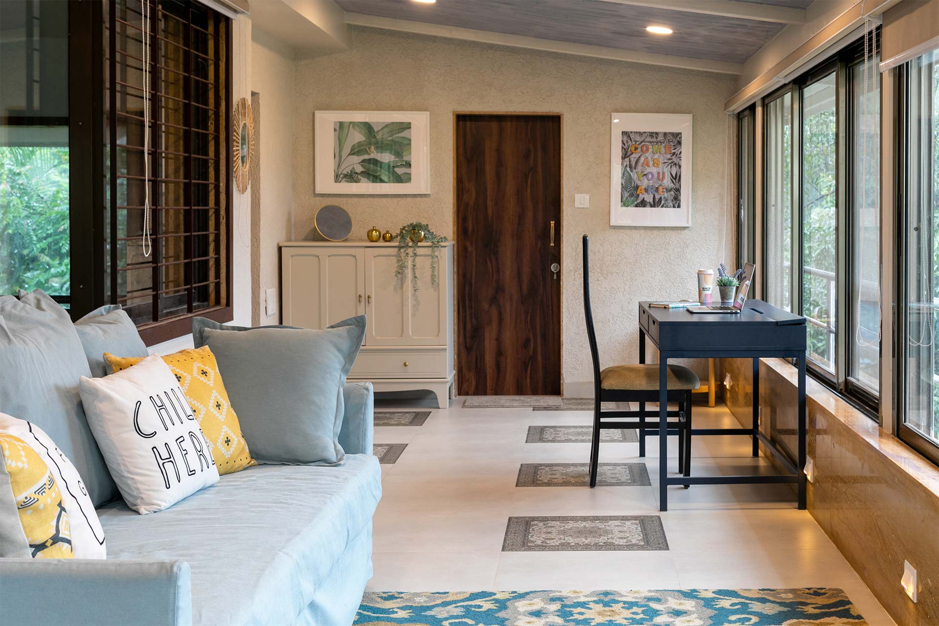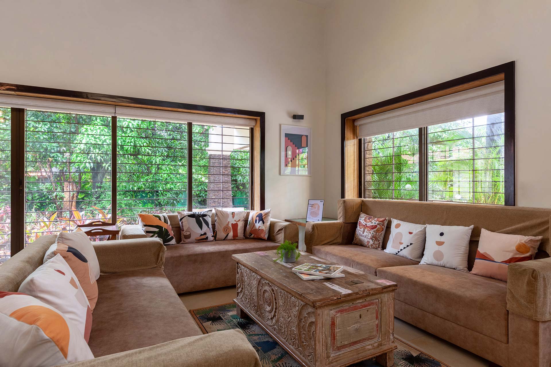 – The home opens up to a spacious living room on the ground floor, replete with plush seating arrangements and stocked bookshelves along with a carrom board.