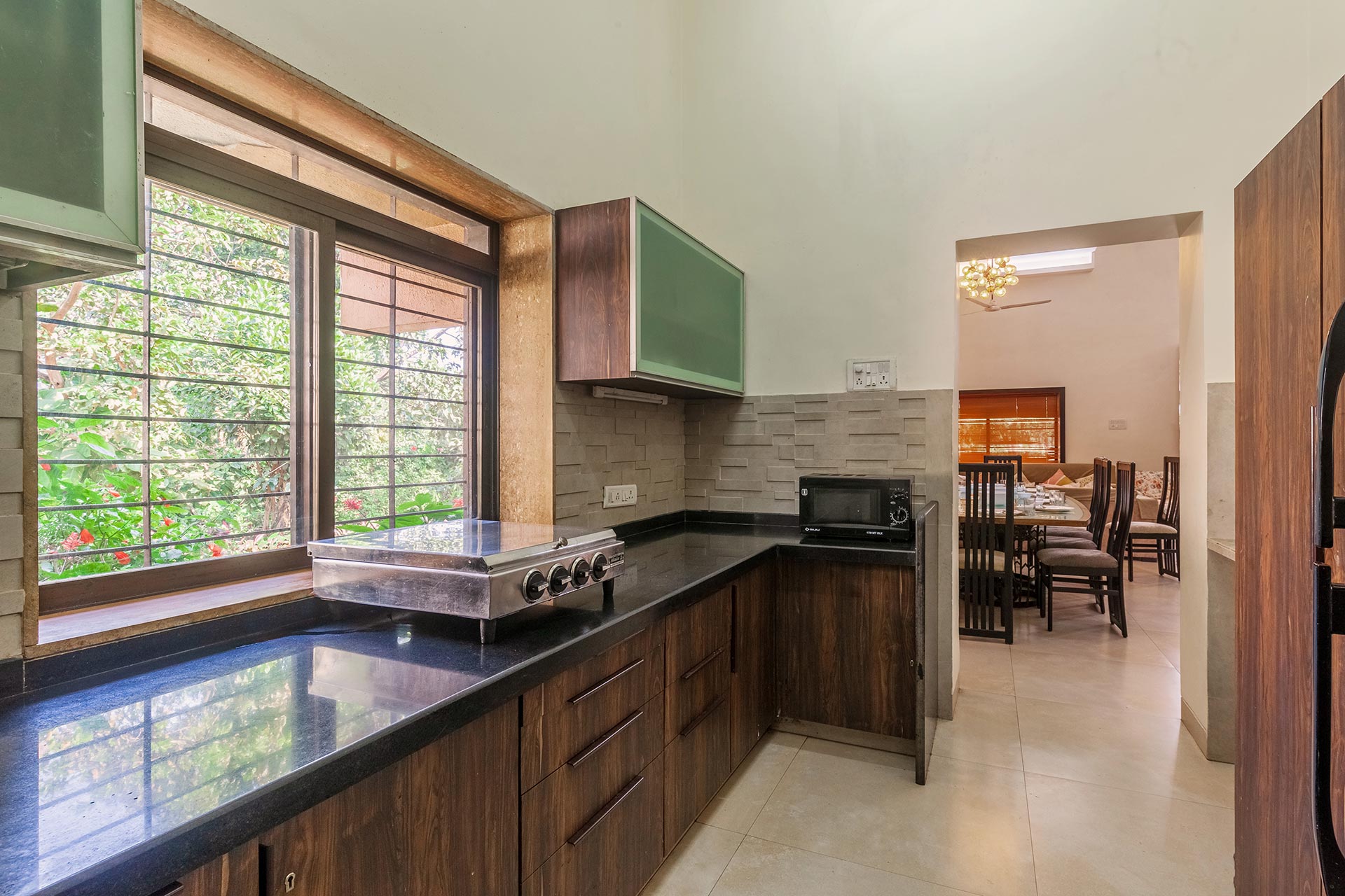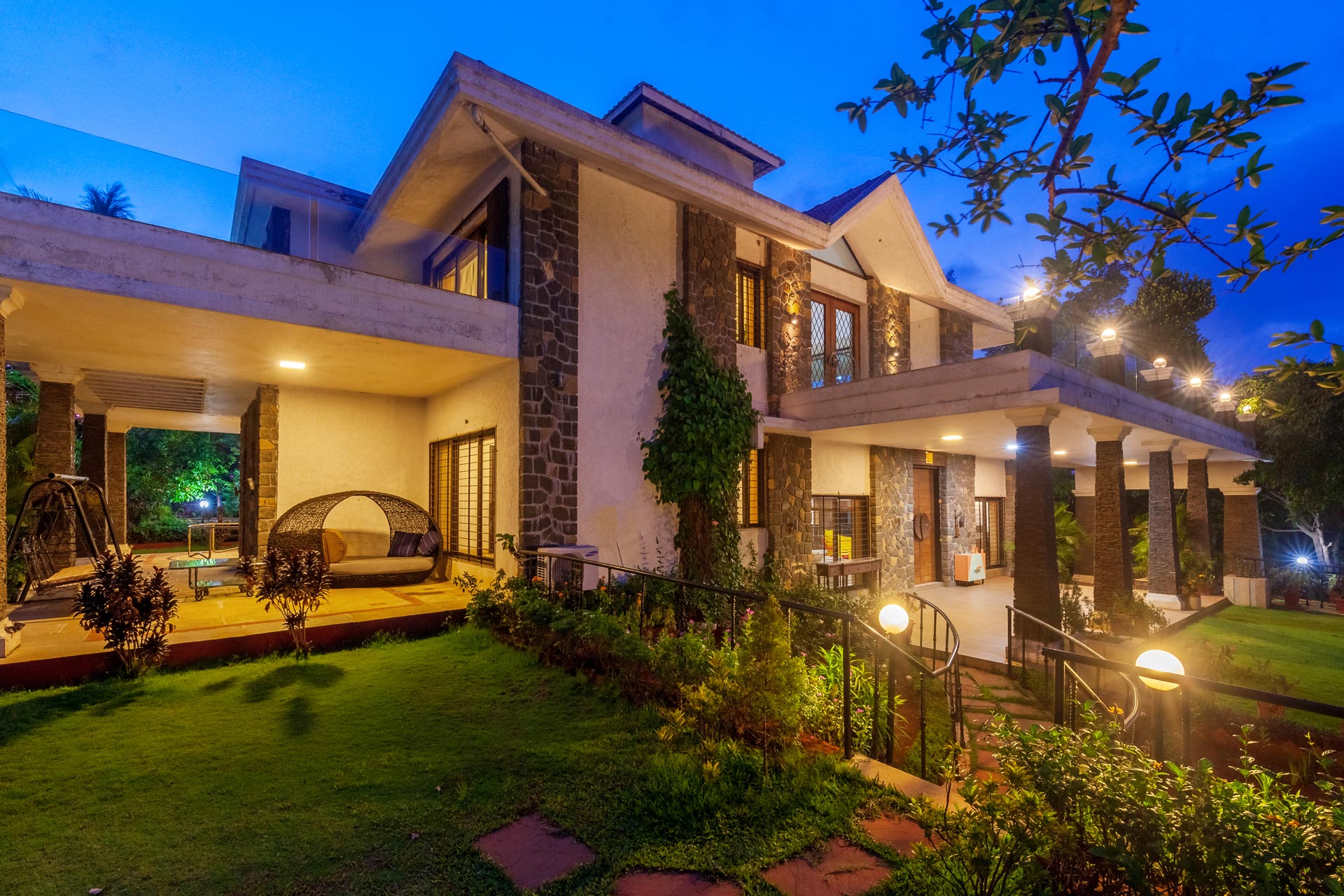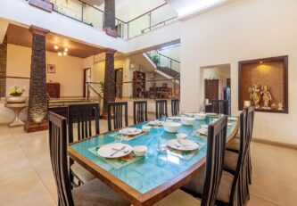 Promising to be a blissful getaway amidst the rising hills of Lonavala, Vista Valencia Villa is a beautiful holiday home. Days here begin with a leisurely stroll on the lawn and a morning cuppa best savoured whilst soaking in the refreshing breeze. There are swings, badminton and a basketball net to keep you and your little ones occupied. For all book lovers, there is a fully stocked bookshelf boasting a variety of reads.