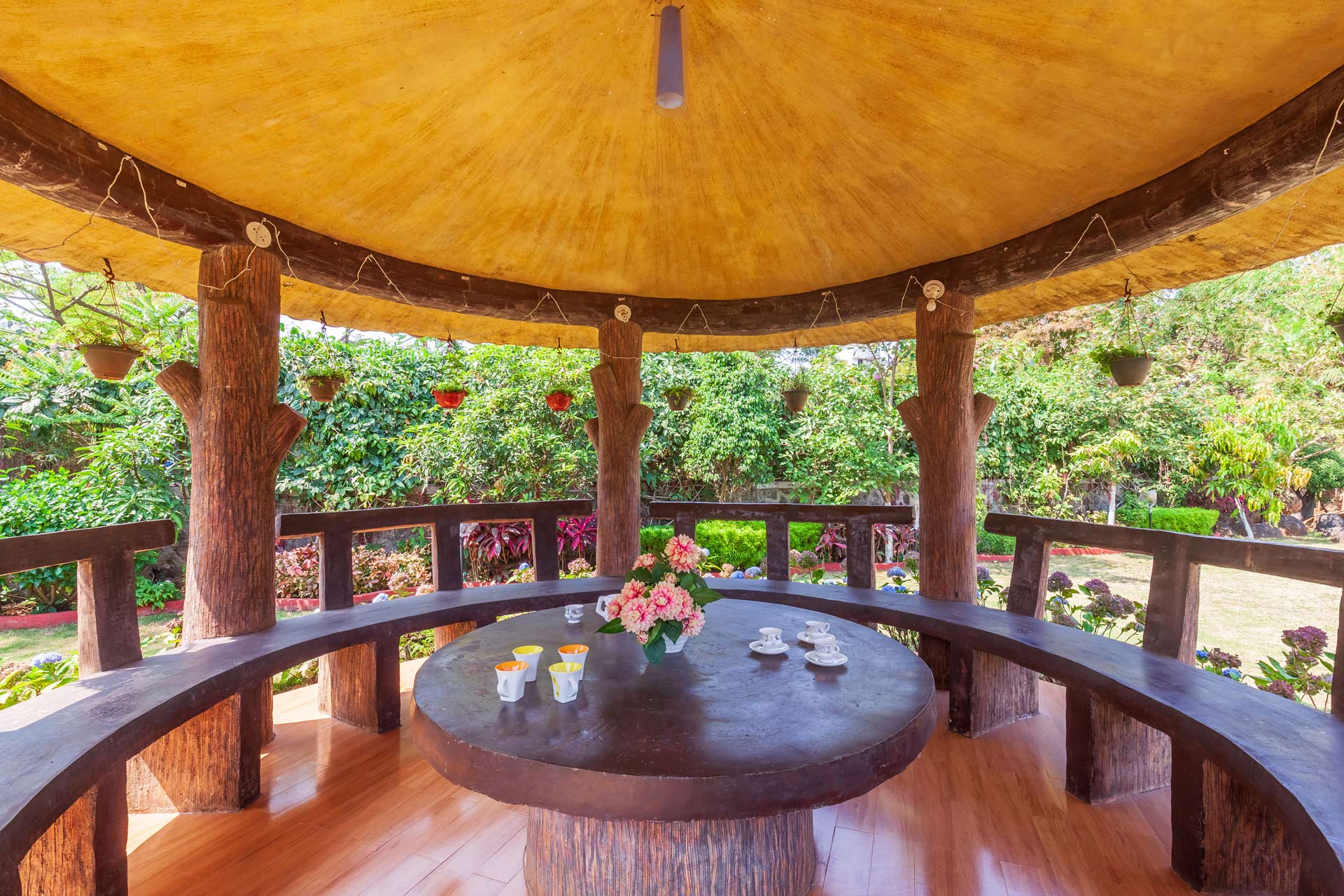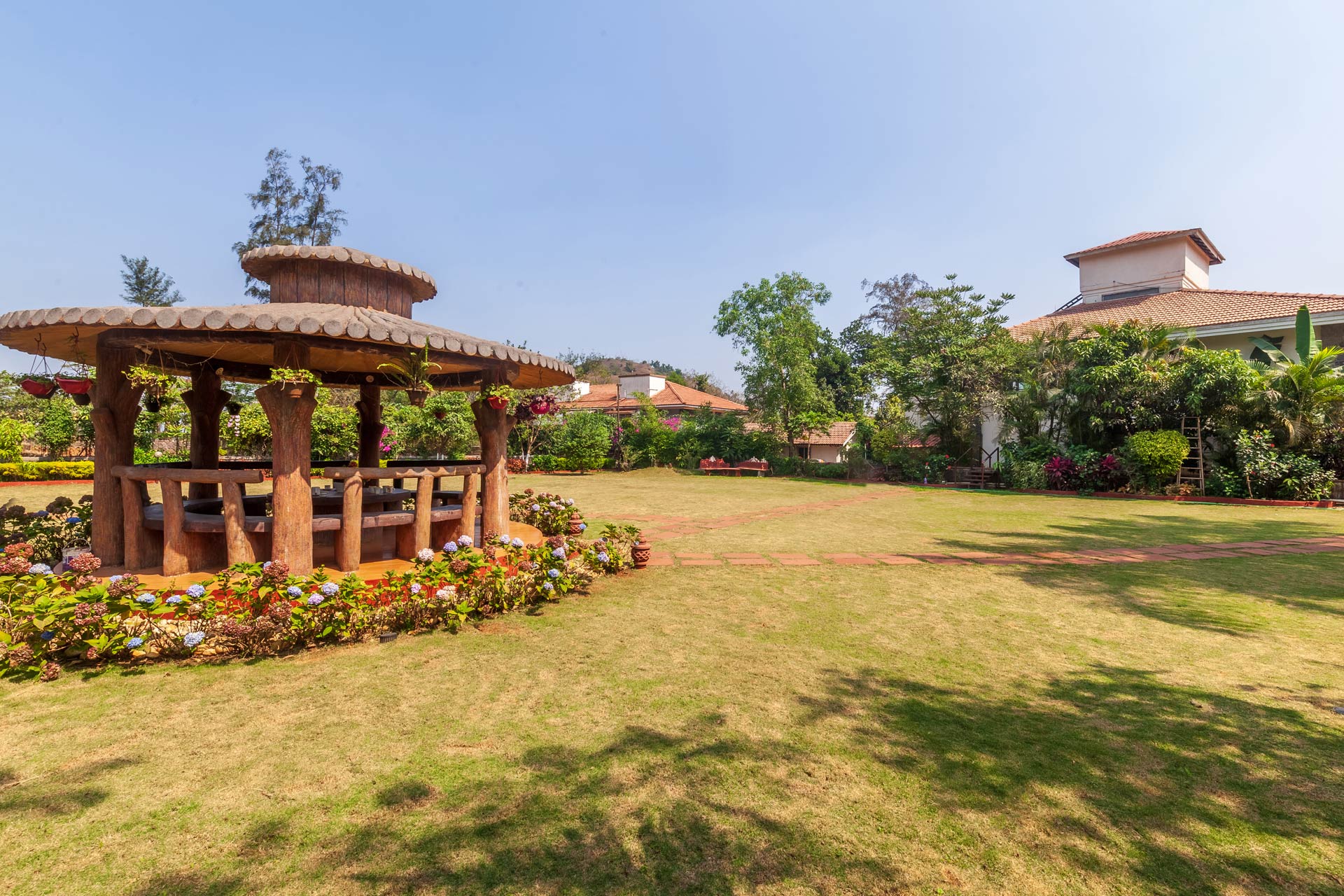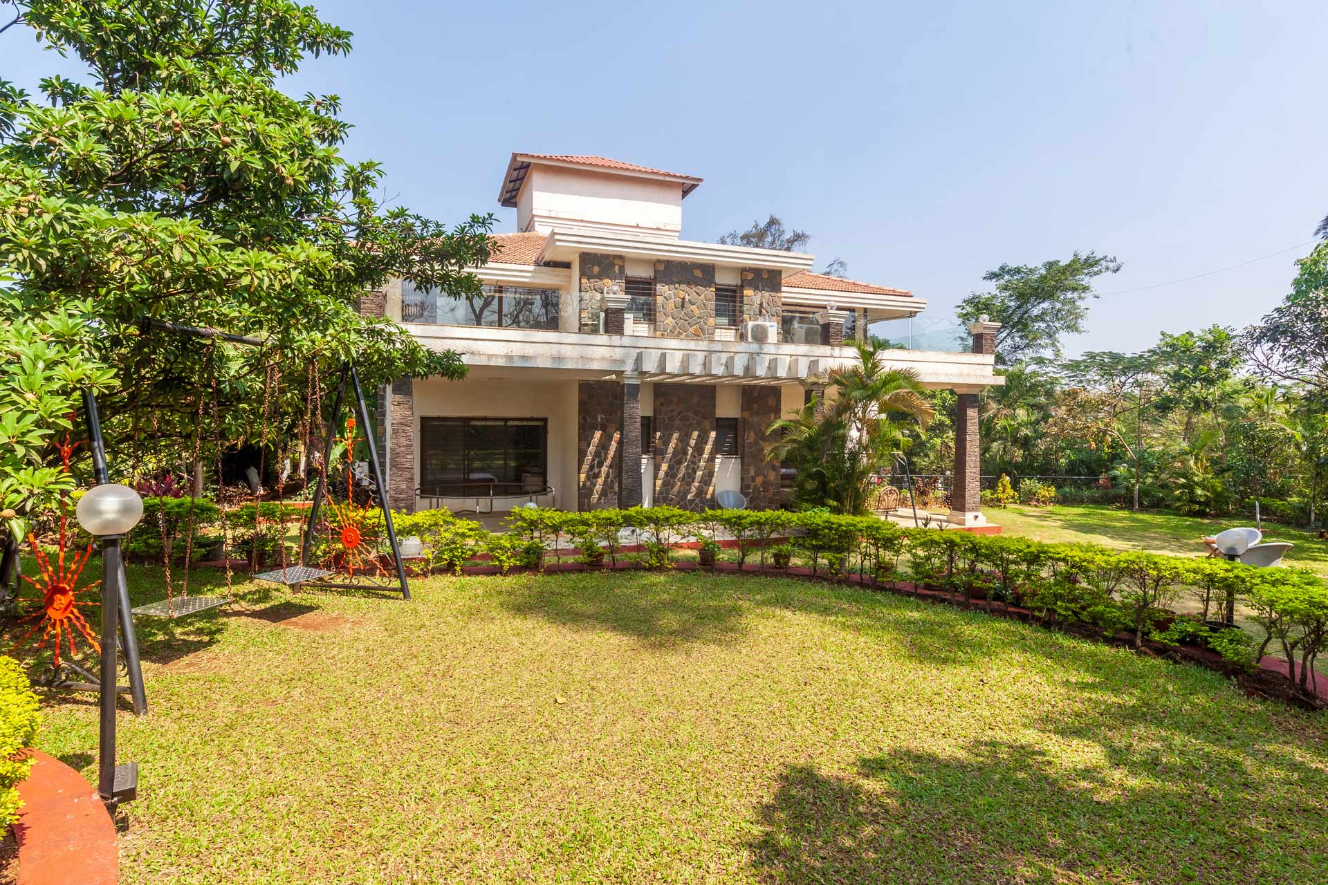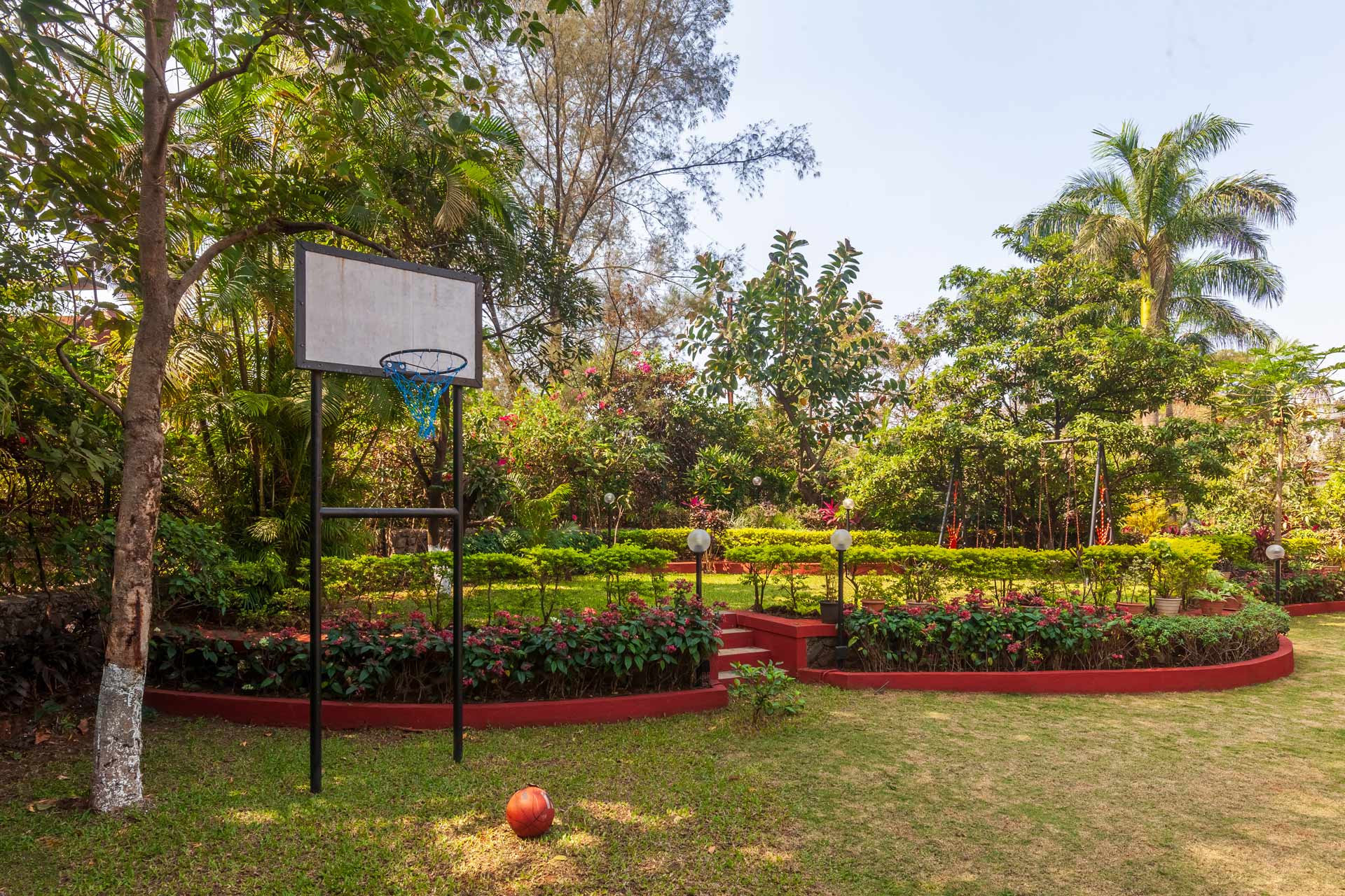 – The exteriors of the property feature massive gardens, featuring a gazebo, swings and a basketball net.
