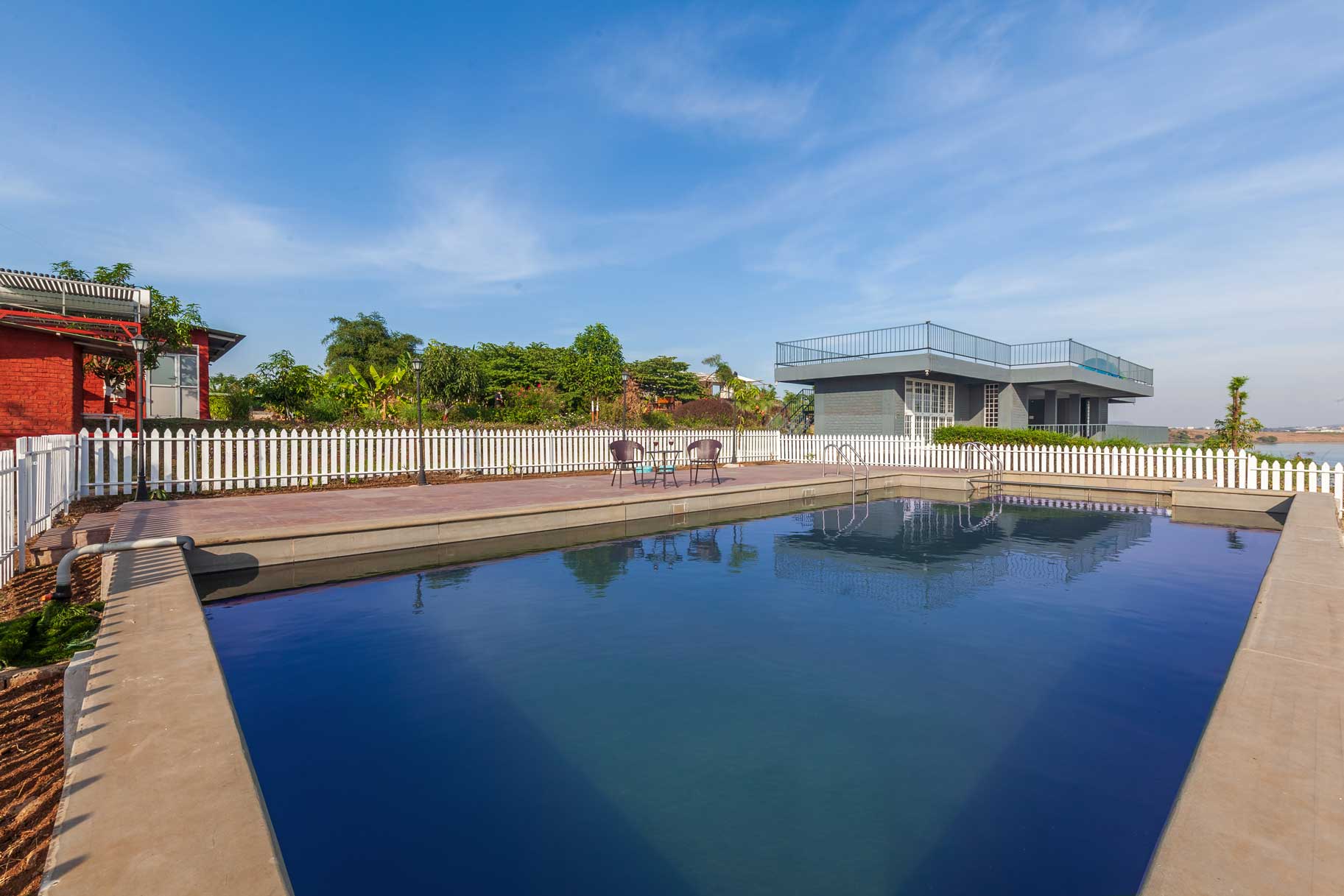 Within the property, guests can enjoy a swim, play outdoor games like box cricket, football or badminton, or enjoy indoor games. Guests can take a peaceful walk in nature and embrace its beauty. Guests can soak in the authentic farm experience and feed the livestock. They can relish scrumptious meals in the open cafe. They can also enjoy the beautiful views from the terrace. They can request for a bonfire to be lit up.