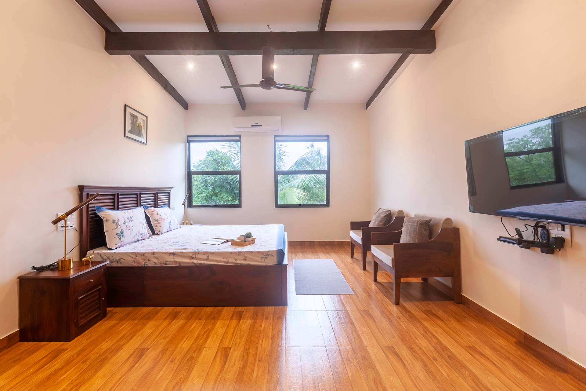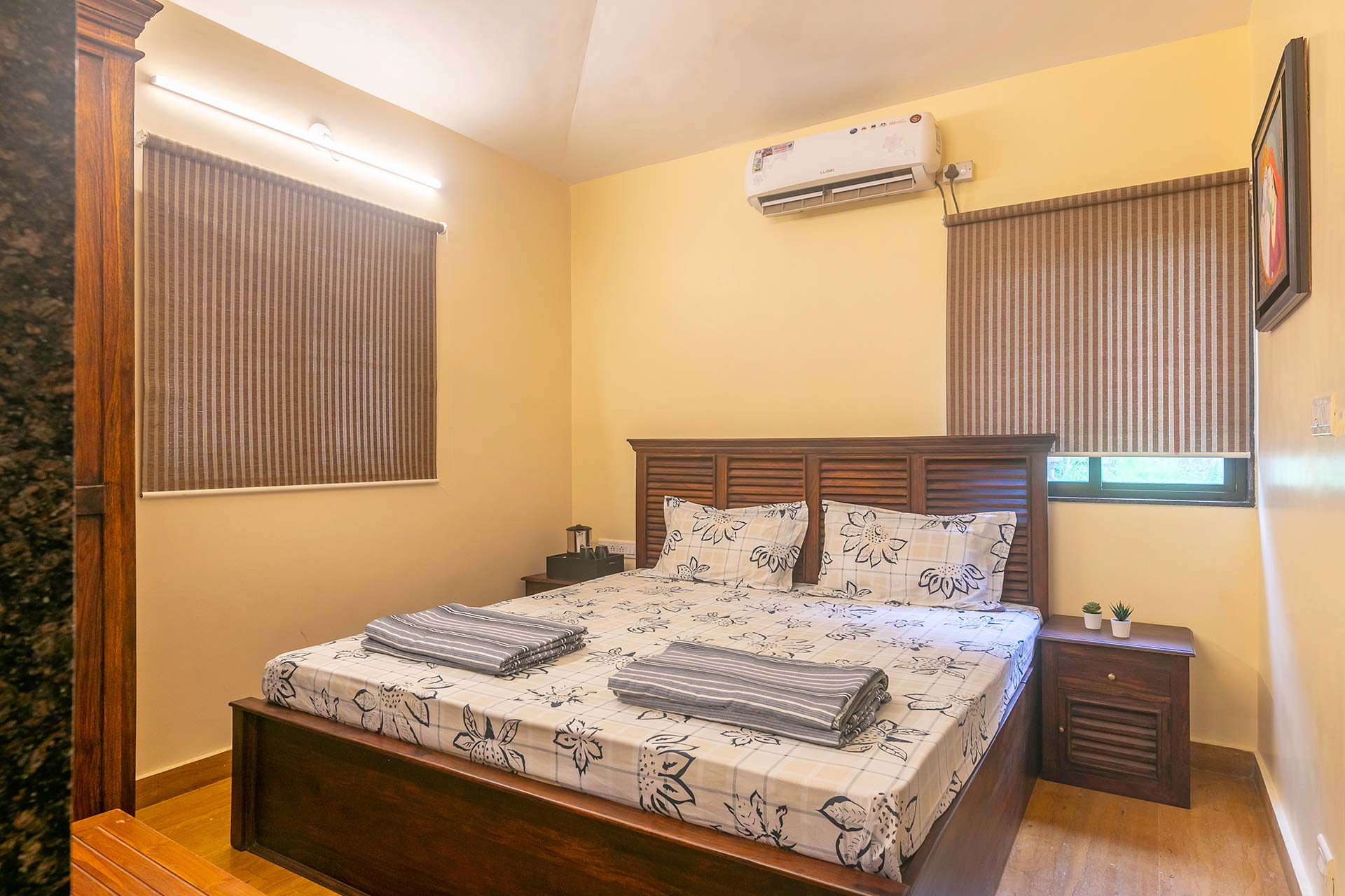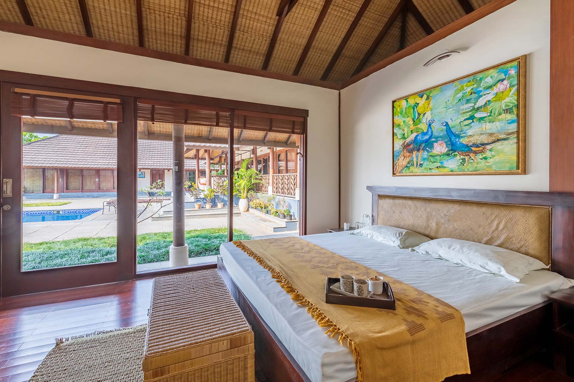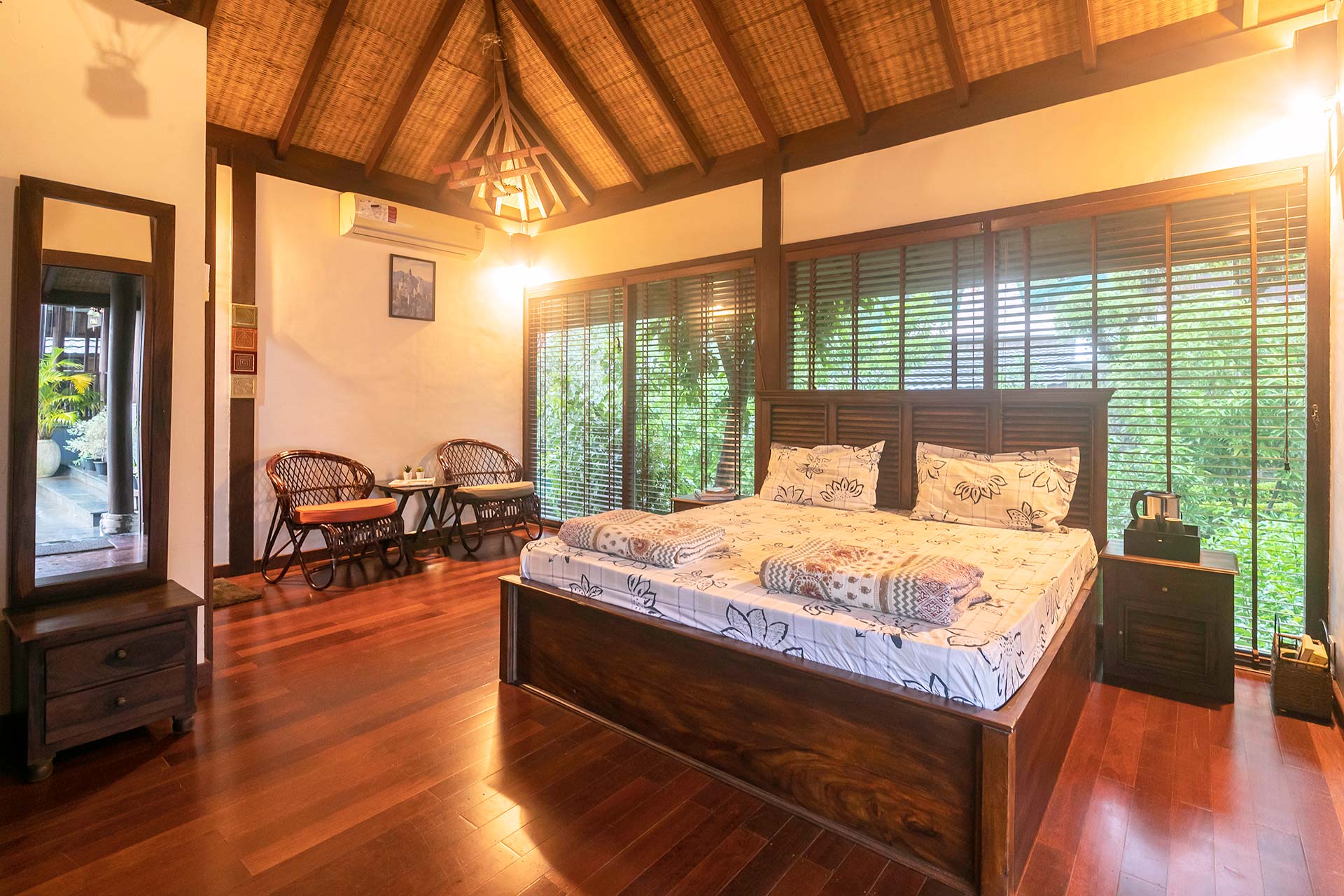 This villa is set up under the shade of a canopy of immense greenery, quaint lawn, and trees where guests can take a peaceful walk.