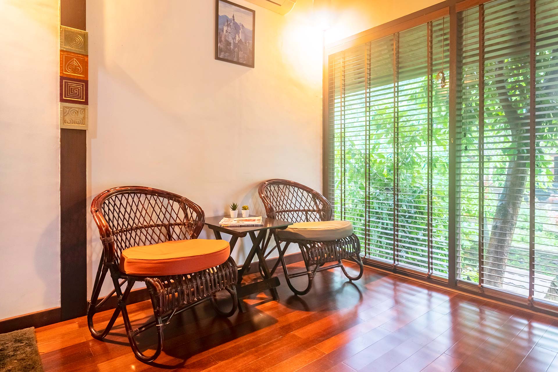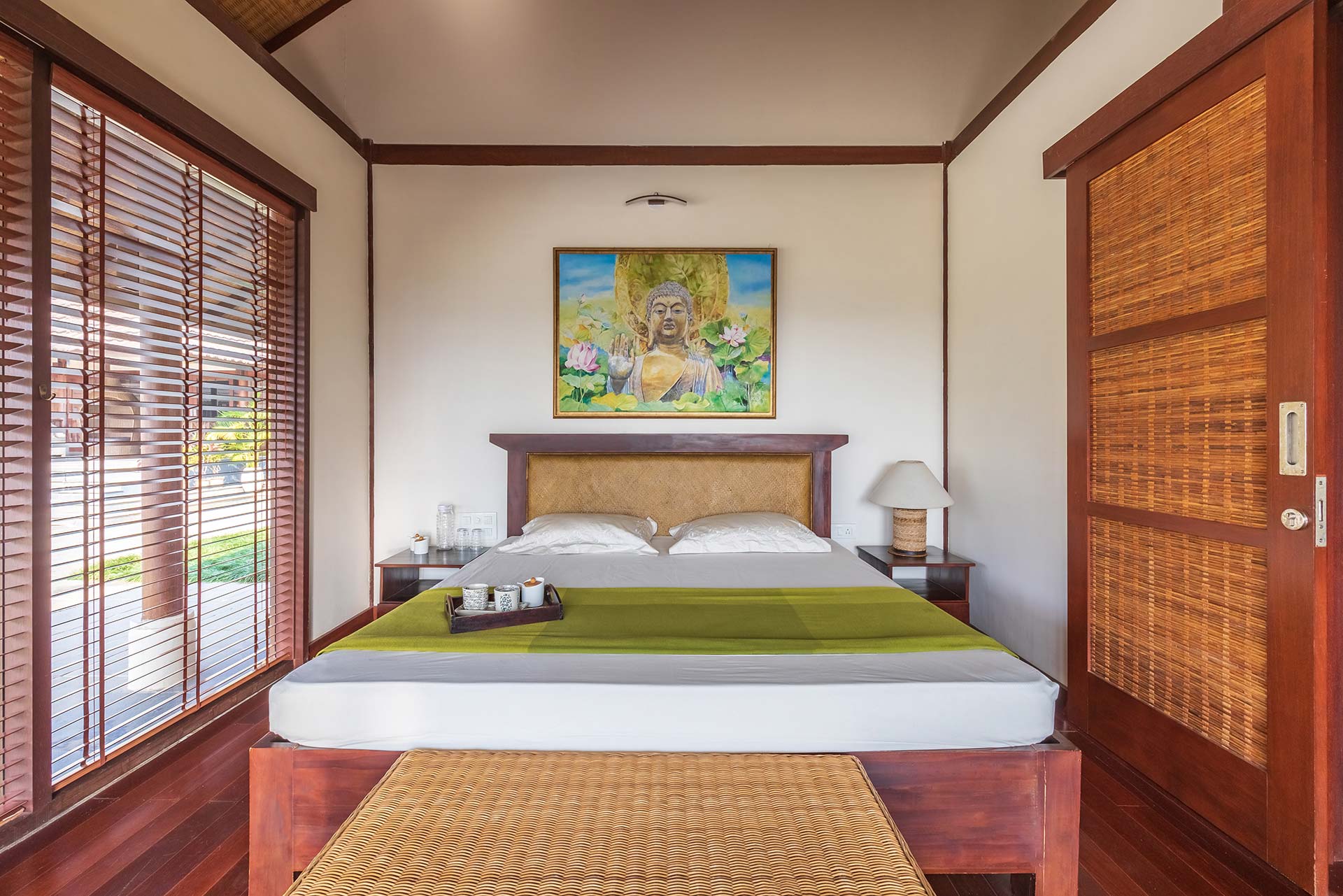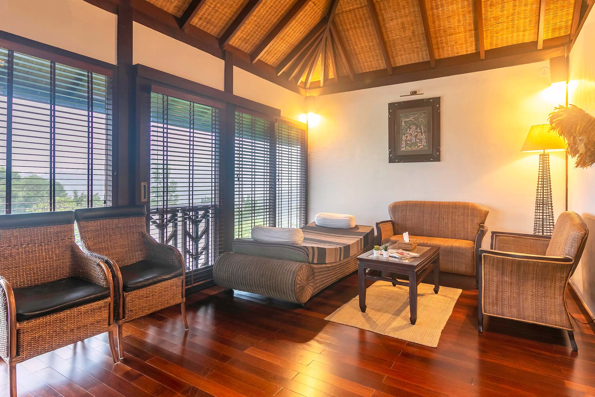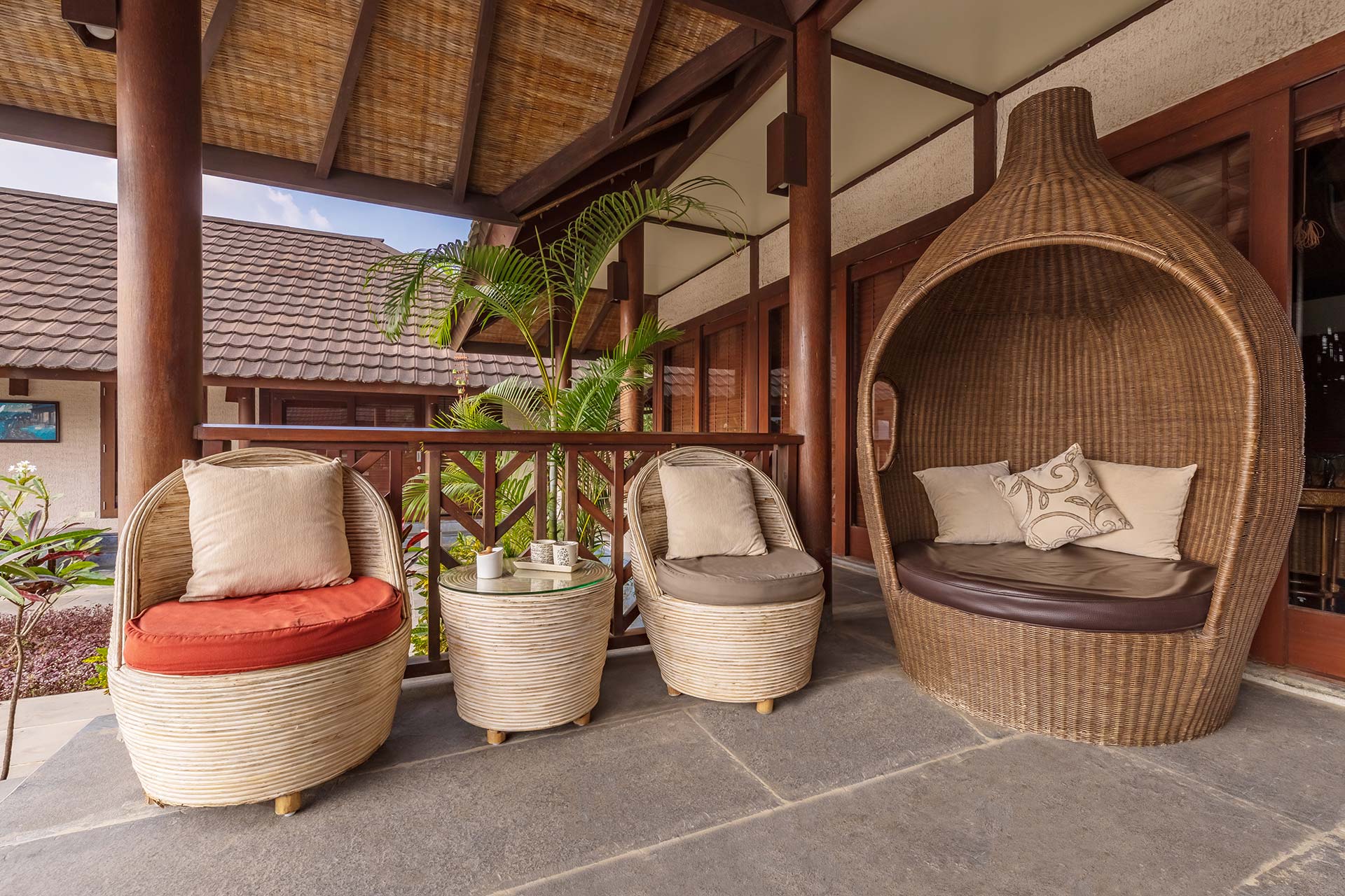 It opens up to a beautiful view of the greenery that surrounds the villa and offers seating arrangements for up to 5 people.