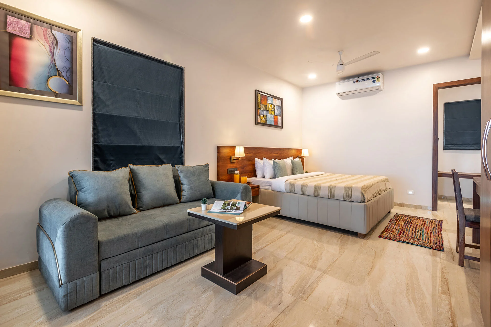 Includes a king-size bed, AC, and a sofa-cum bed.