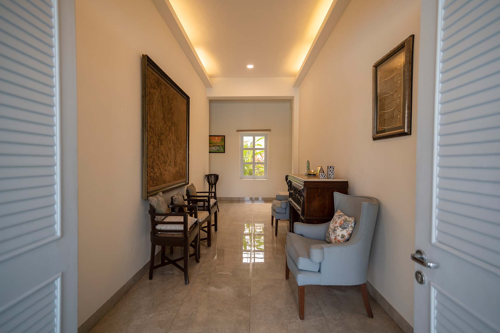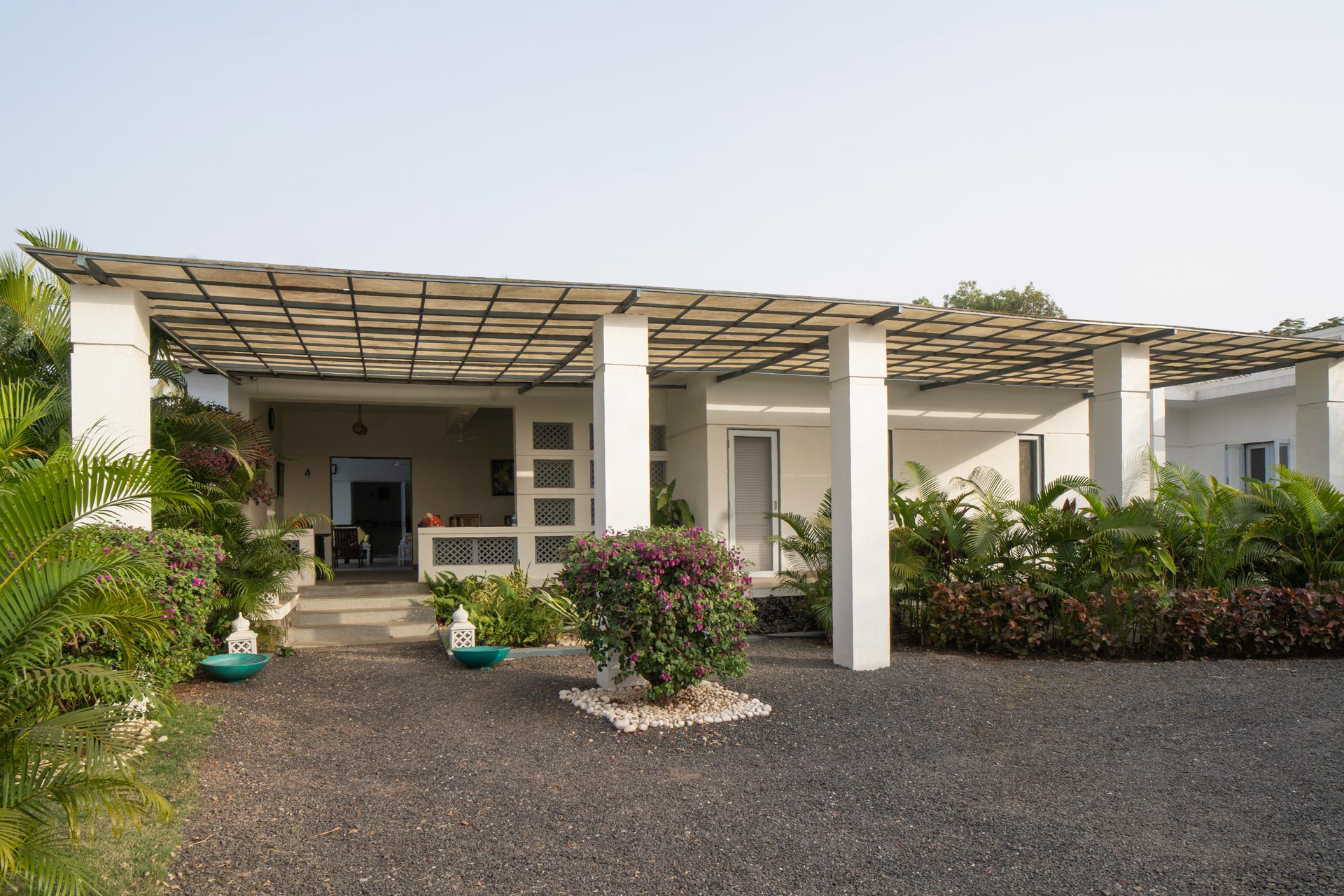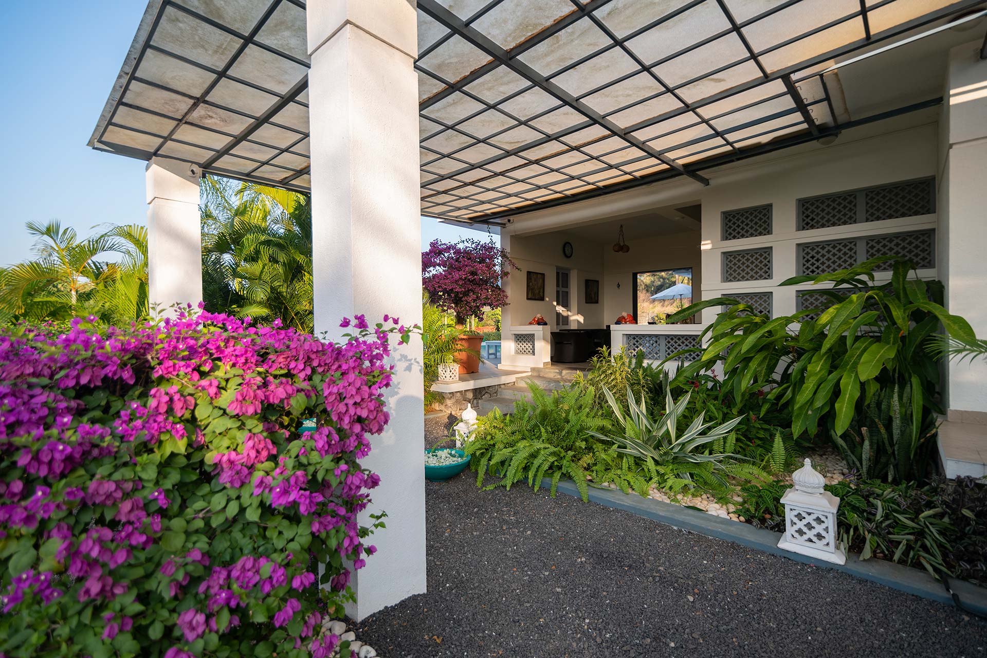 – The exteriors of the home feature a manicured U-shaped garden, 4000 sq. ft. in size. It is adorned with loungers, ideal for unwinding.