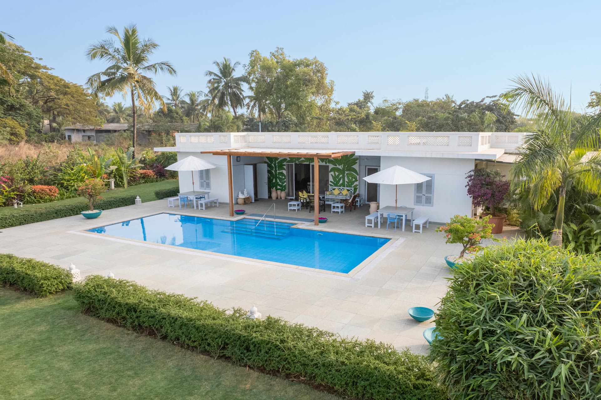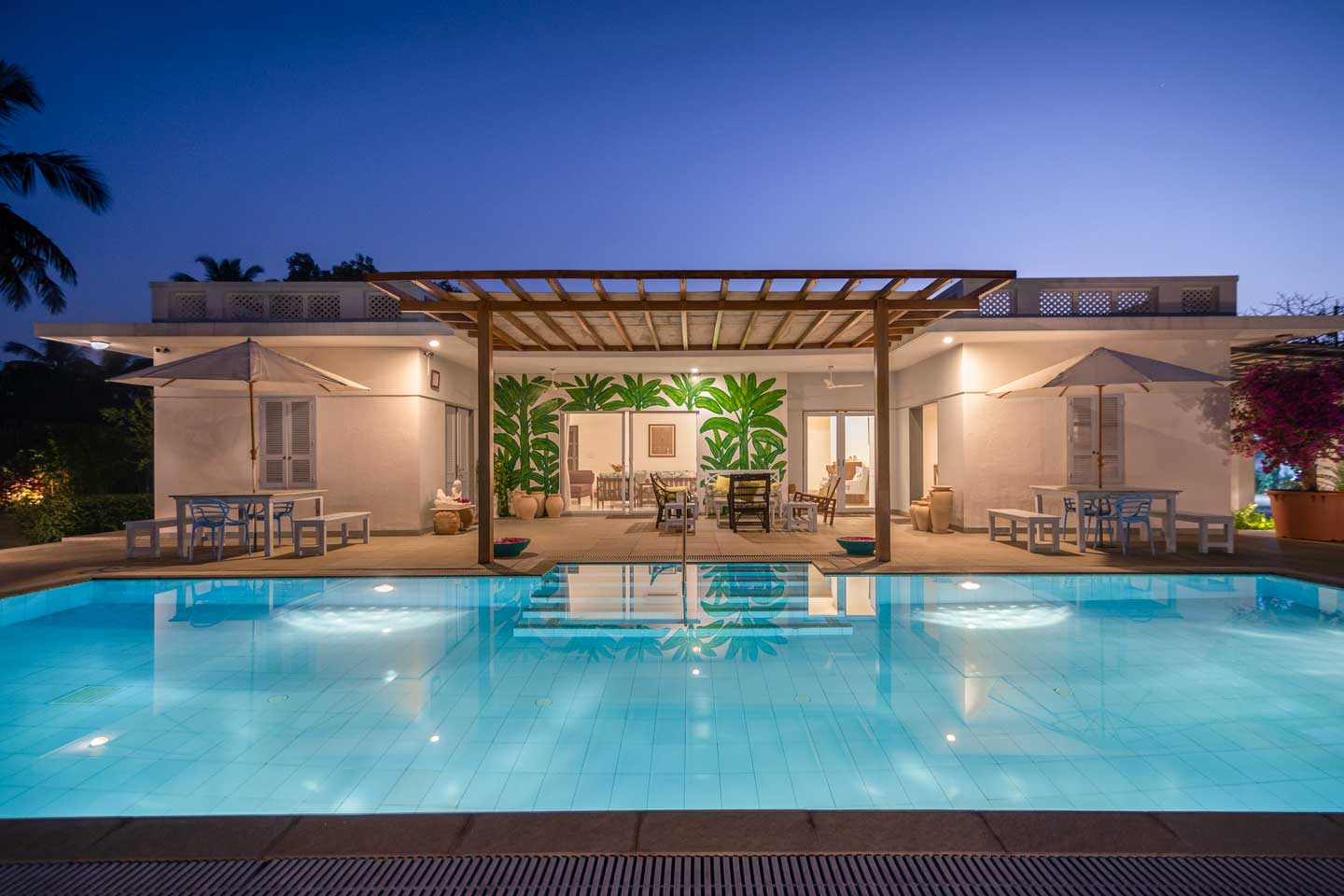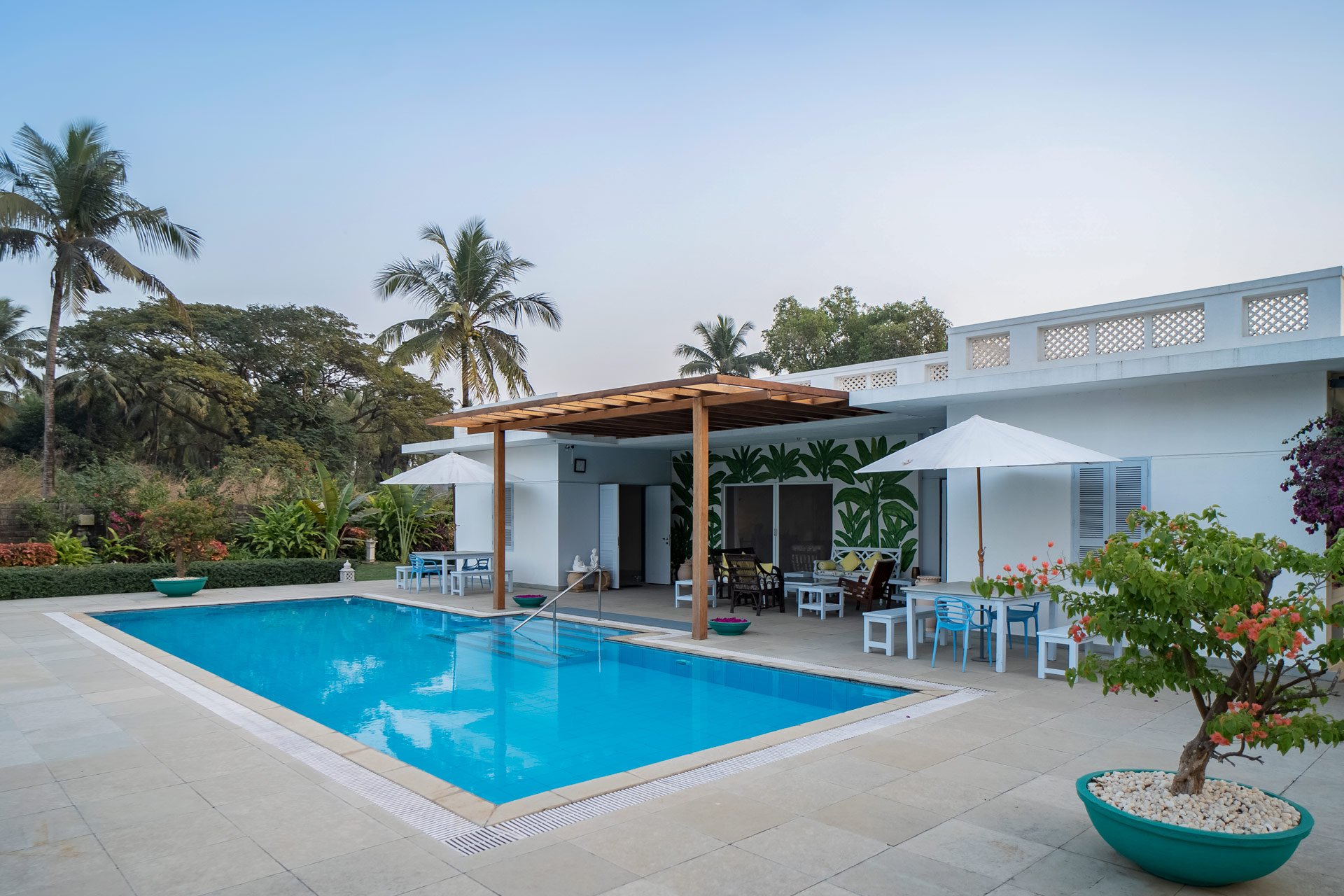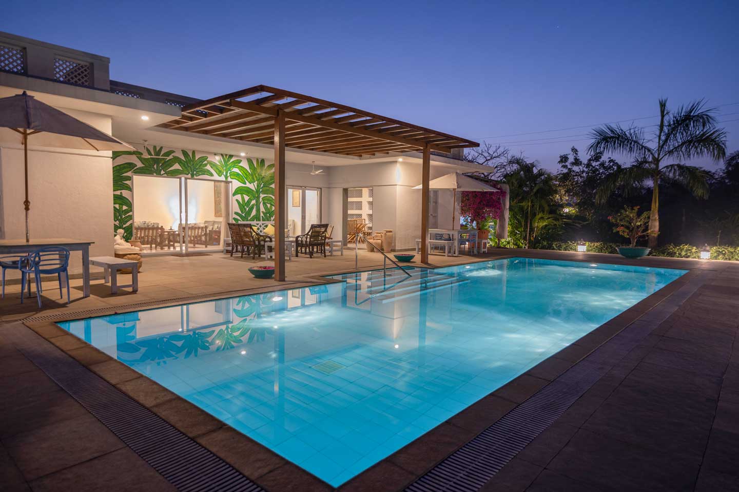 Far away from the flurry and cacophony that follows the city life, Whispering Palms is a sprawling holiday home placed amidst towering palms and green verdancy that can easily be your next weekend getaway destination, ideal for accommodating 9 people including infants. With modern and chic interiors, the spacious indoor spaces feature a spread of amenities that promise a memorable stay. Other appealing attributes of this home include a beautifully landscaped U-shaped lawn, ideal for a game of catch, and a private swimming pool overlooking the surrounding greenery. Certainly making for a sunkissed getaway in the coastal town of Alibaug, this charming home serves as the perfect respite from the monotony!