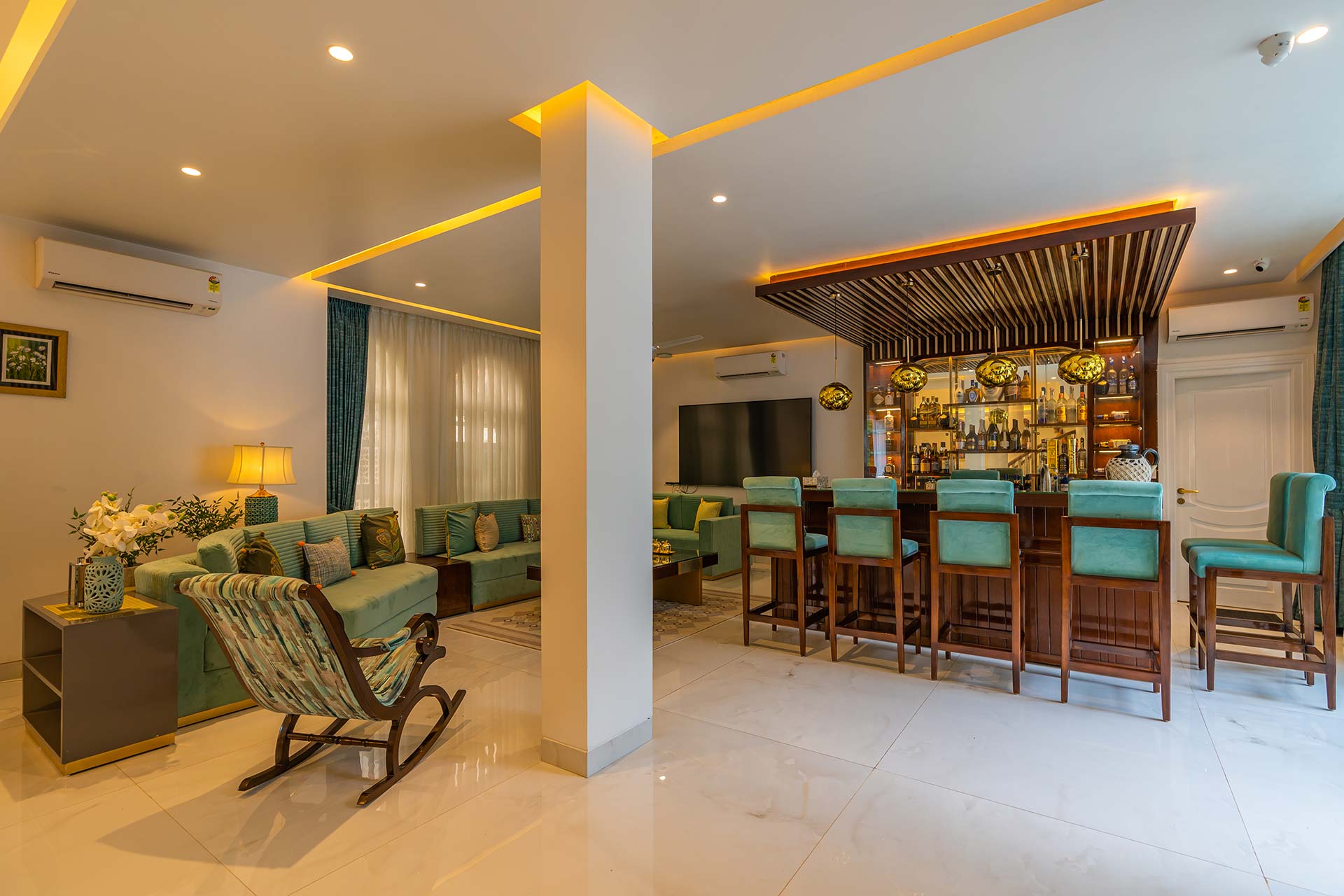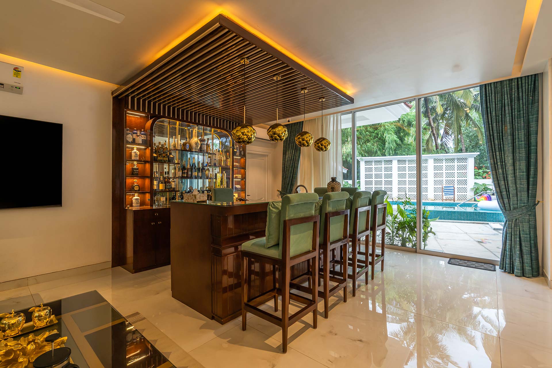 This luxurious property boasts both indoor and outdoor bar areas, where guests can create and savour drinks of their choice.