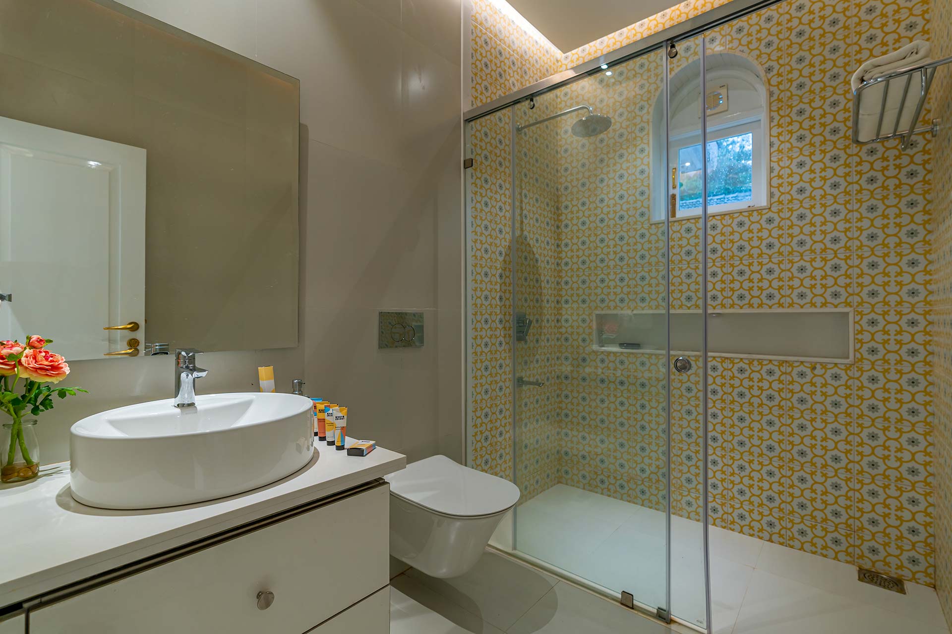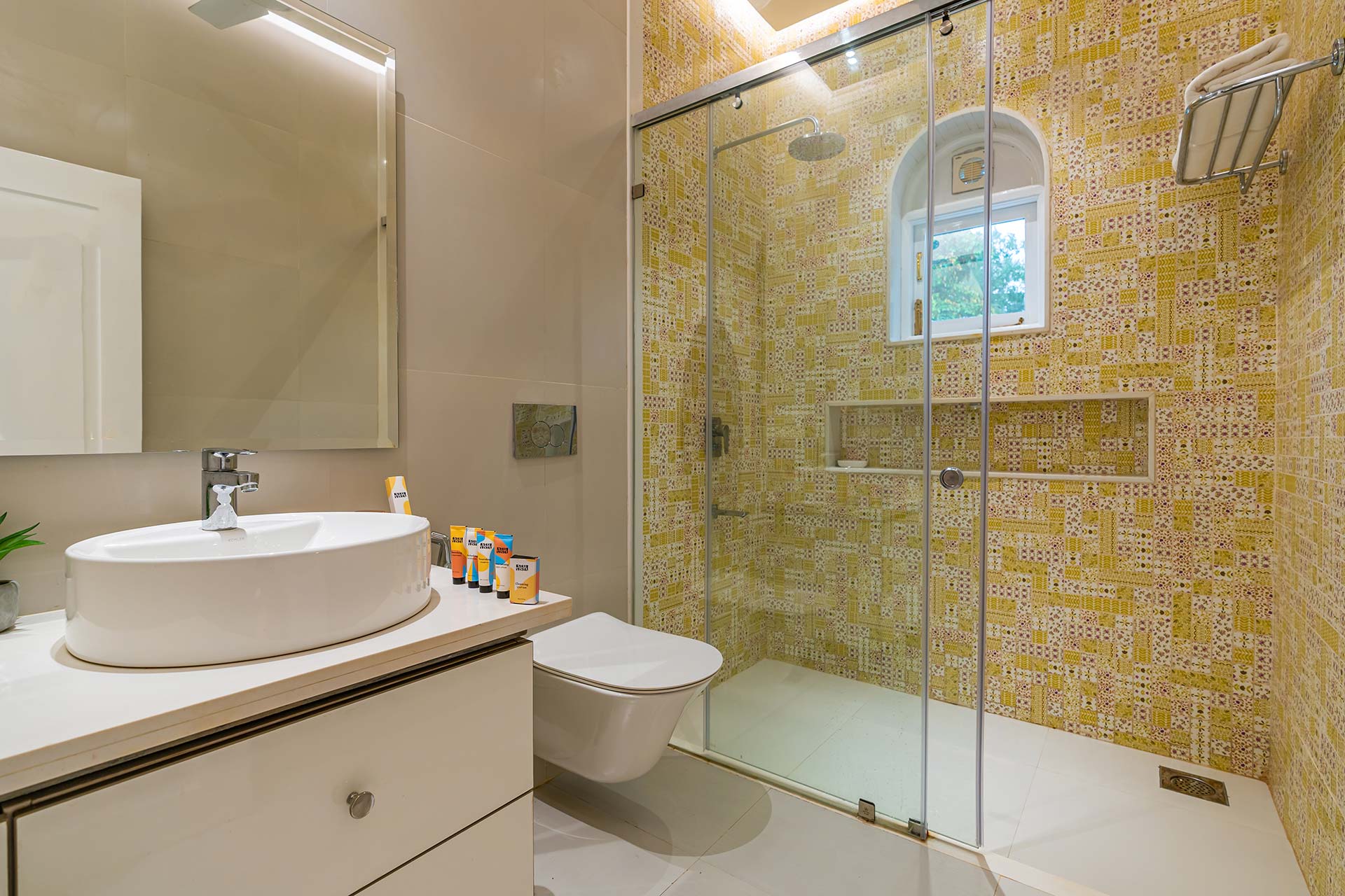 Each bathroom is equipped with a geyser, towels, and basic toiletries for the guests’ convenience.